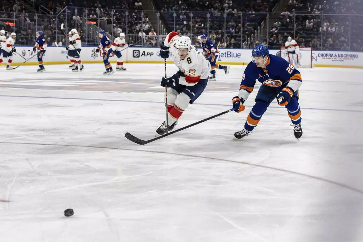 New York Islanders defenseman Alexander Romanov, left, and Florida Panthers defenseman Gustav Forsling, right, compete for the puck during the second period of an NHL hockey game, Sunday, March 16, 2025, in Elmont, N.Y. (AP Photo/Stefan Jeremiah)