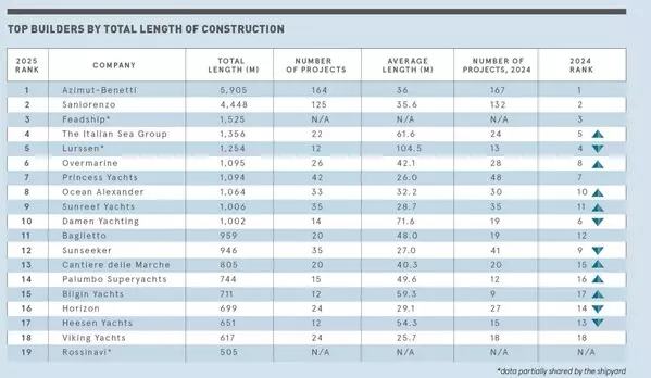 HONG KONG, March 17, 2025 /PRNewswire/ -- Azimut|Benetti Group is number one in the production of mega yachts over 24 meters, leading the industry in the Global Order Book 2025, the annual ranking by the reference publication Boat International based on data from 185 shipyards on 5 continents.