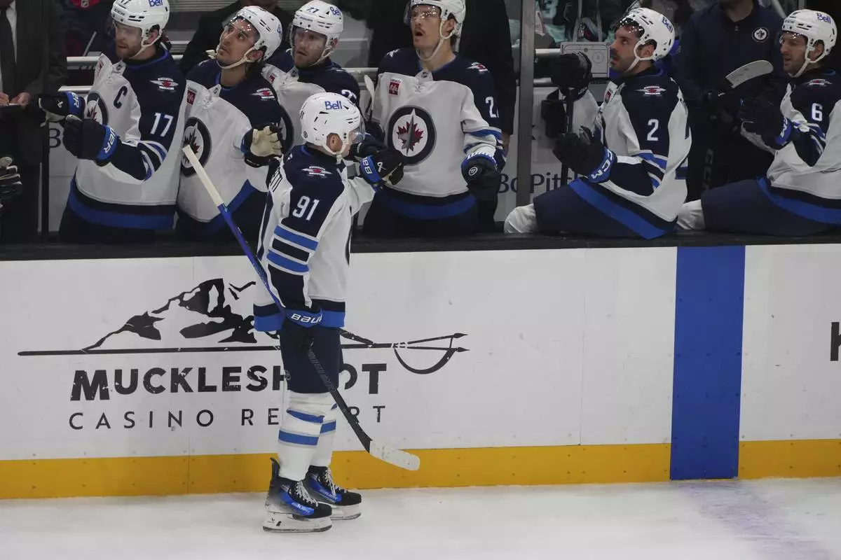 Winnipeg Jets center Cole Perfetti greets the bench after scoring against the Seattle Kraken during the first period of an NHL hockey game Sunday, March 16, 2025, in Seattle. (AP Photo/Lindsey Wasson)