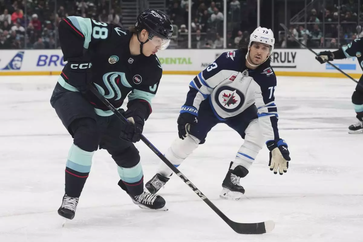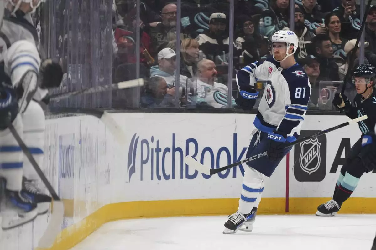 Winnipeg Jets left wing Kyle Connor (81) reacts to scoring as Seattle Kraken defenseman Ryker Evans, right, looks on during the second period of an NHL hockey game Sunday, March 16, 2025, in Seattle. (AP Photo/Lindsey Wasson)