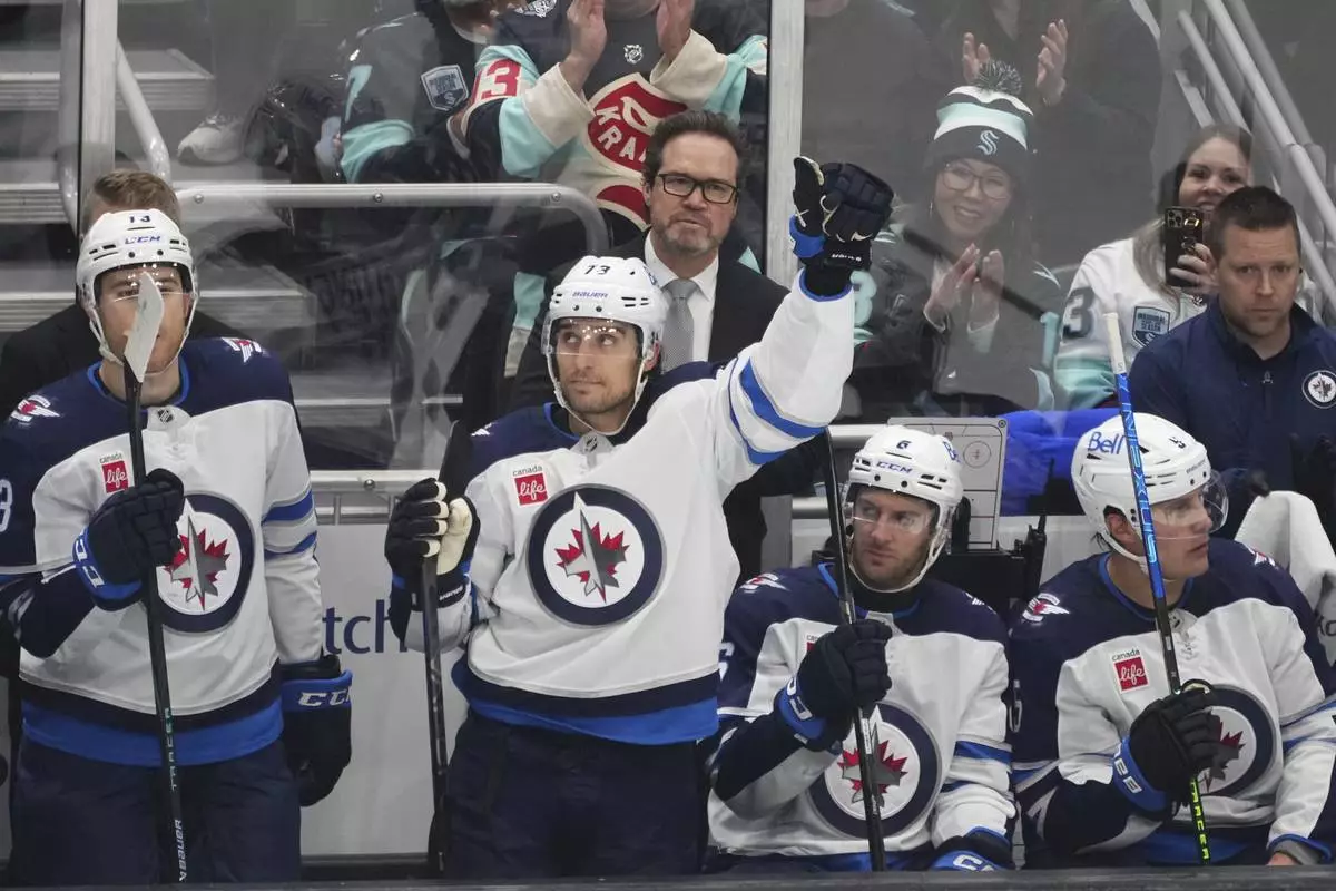 Former Seattle Kraken player, Winnipeg Jets left wing Brandon Tanev (73) acknowledges the crowd after a tribute video was played for him during a timeout during the first period of an NHL hockey game Sunday, March 16, 2025, in Seattle. (AP Photo/Lindsey Wasson)