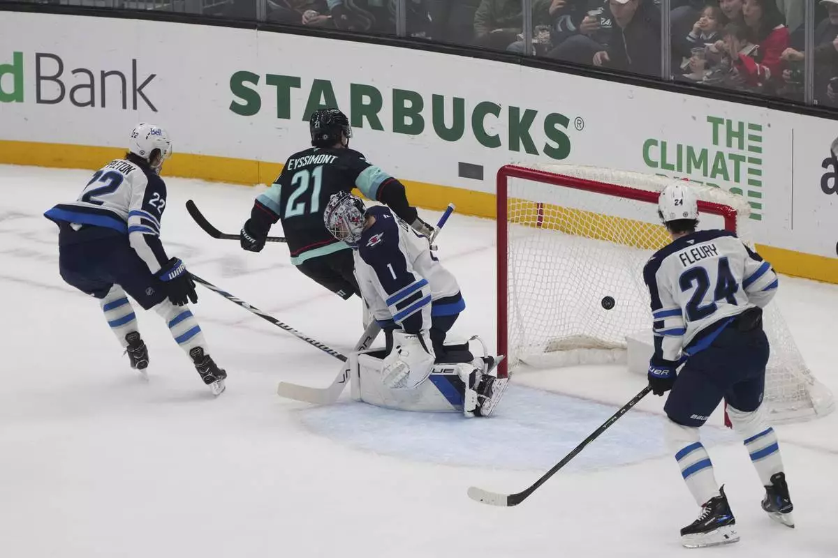 Seattle Kraken center Michael Eyssimont (21) reacts after scoring against Winnipeg Jets goaltender Eric Comrie (1) as center Mason Appleton (22) and defenseman Haydn Fleury (24) look on during the first period of an NHL hockey game Sunday, March 16, 2025, in Seattle. (AP Photo/Lindsey Wasson)