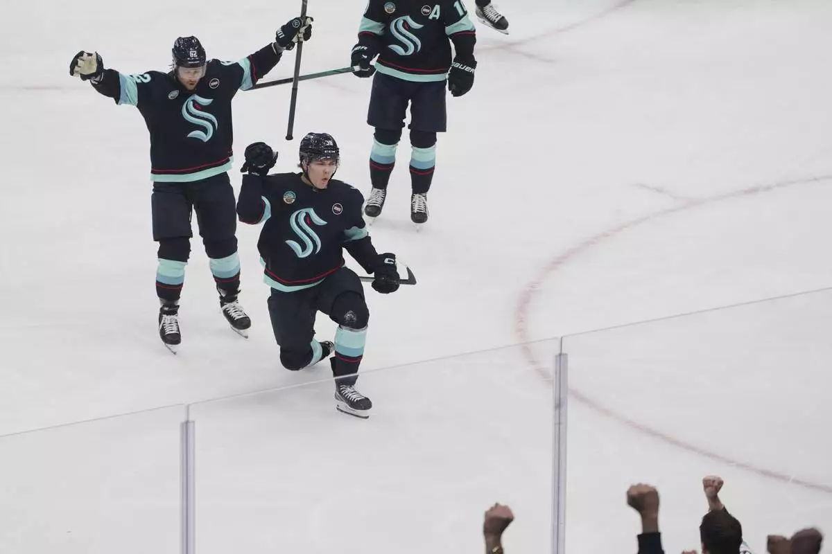 Seattle Kraken right wing Jani Nyman, center, reacts to scoring against the Winnipeg Jets with teammates Brandon Montour, left, during the first period of an NHL hockey game Sunday, March 16, 2025, in Seattle. (AP Photo/Lindsey Wasson)