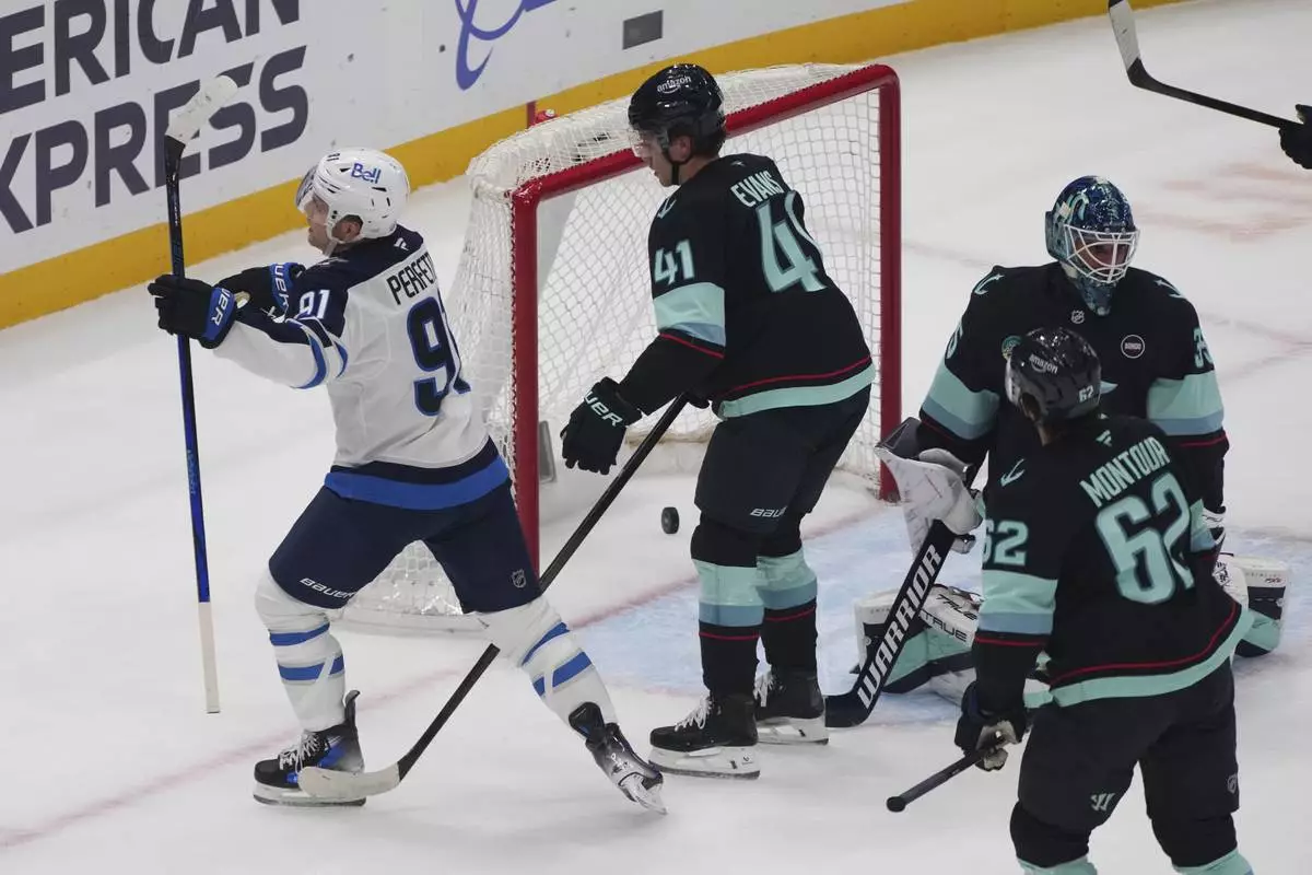 Winnipeg Jets center Cole Perfetti (91) reacts to scoring a goal against Seattle Kraken goaltender Joey Daccord, right, as defenseman Ryker Evans (41) and defenseman Brandon Montour (62) look on during the first period of an NHL hockey game Sunday, March 16, 2025, in Seattle. (AP Photo/Lindsey Wasson)