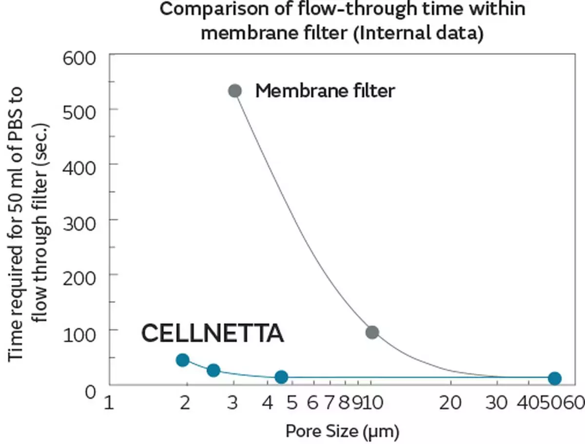 Case Study 1: Time taken to pass 50 ml of Phosphate-Buffered Saline (PBS) through a membrane filter with a pore size of 5 µm compared to CELLNETTA.