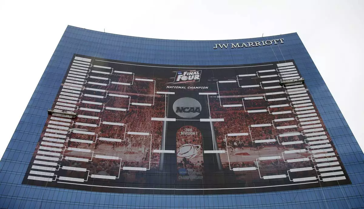 FILE - FILE- In this March 16, 2015, file photo, workers add team names to a 2015 NCAA Division I men's basketball tournament bracket that is displayed on the side of the JW Marriott in Indianapolis. (AP Photo/Darron Cummings, File)