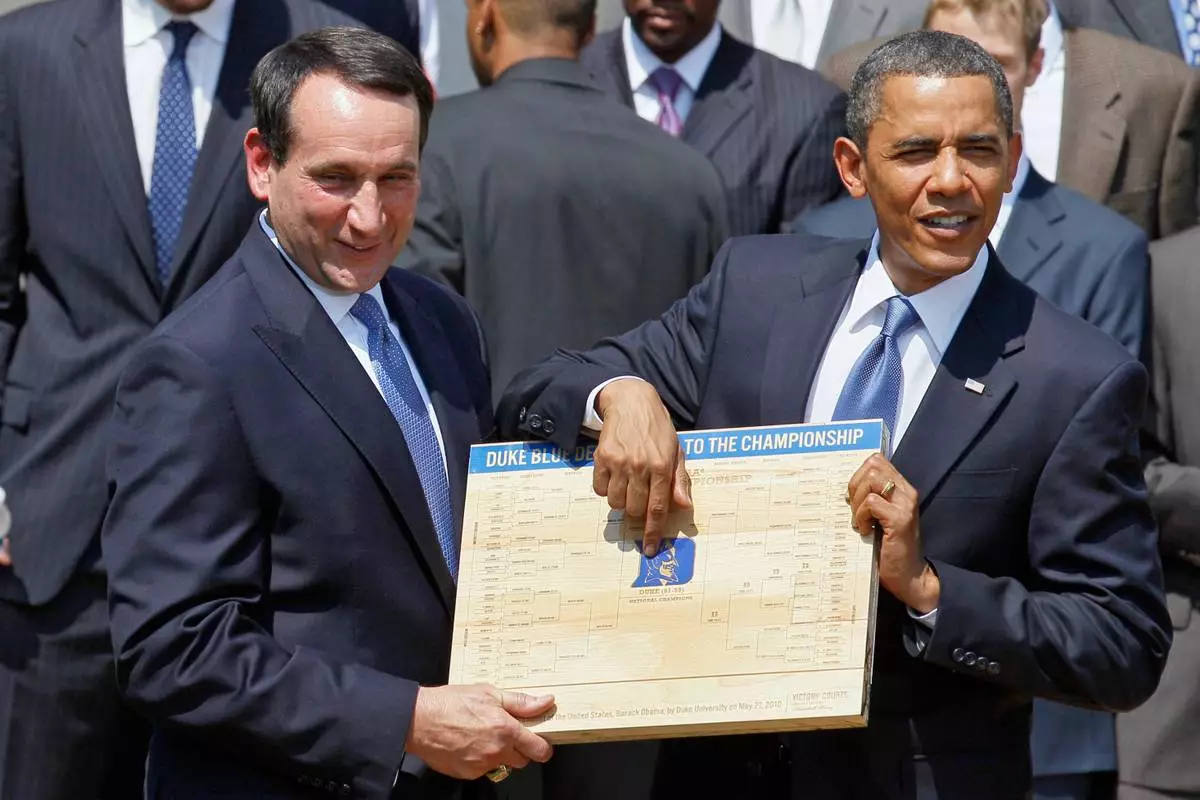 FILE - In this May 27, 2010 file photo, President Barack Obama looks over the bracket with Duke University basketball Coach Mike Krzyzewski in the Rose Garden of the White House in Washington, where he honored the team. (AP Photo/Alex Brandon, File)