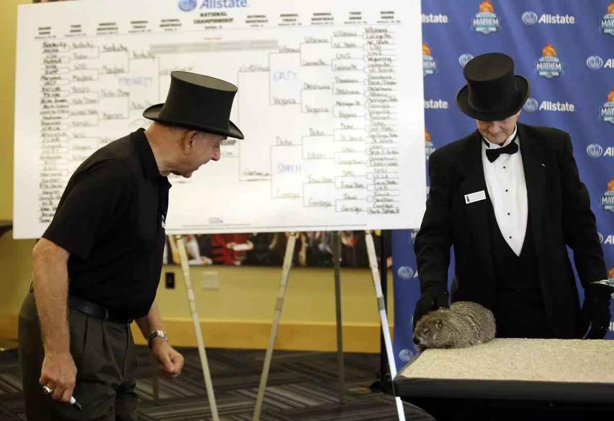 FILE - Basketball analyst Dick Vitale, left, talks with groundhog Punxsutawney Phil as Groundhog Club member John Griffiths listens during a a bracket-picking contest for the NCAA Tournament, Tuesday, March 17, 2015, in Indianapolis. Vitale picked Kentucky to win the tournament while Phil selected Villanova. (AP Photo/Darron Cummings, File)