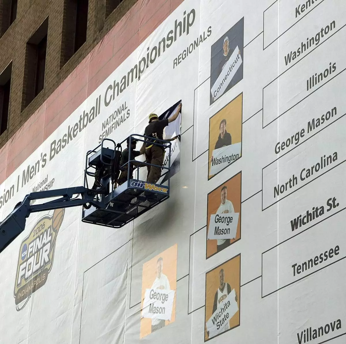 FILE - Construction workers fill out the Final Four NCAA college basketball bracket on the side of the Hyatt Regency building in Indianapolis, Thursday, March 30, 2006. (AP Photo/Ann Heisenfelt, File)