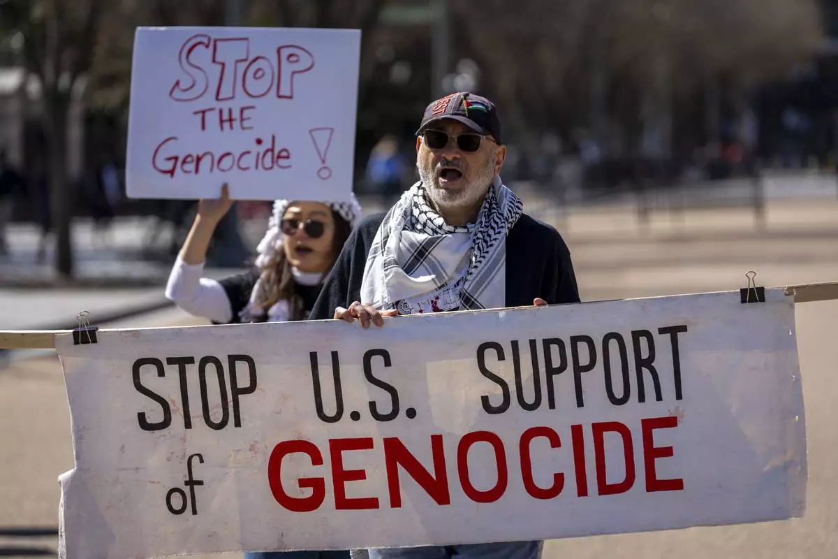 People protest against the war in Gaza outside the White House in Washington, Tuesday, March 18, 2025. (AP Photo/Ben Curtis)