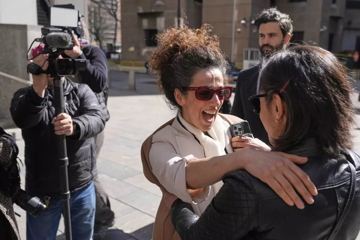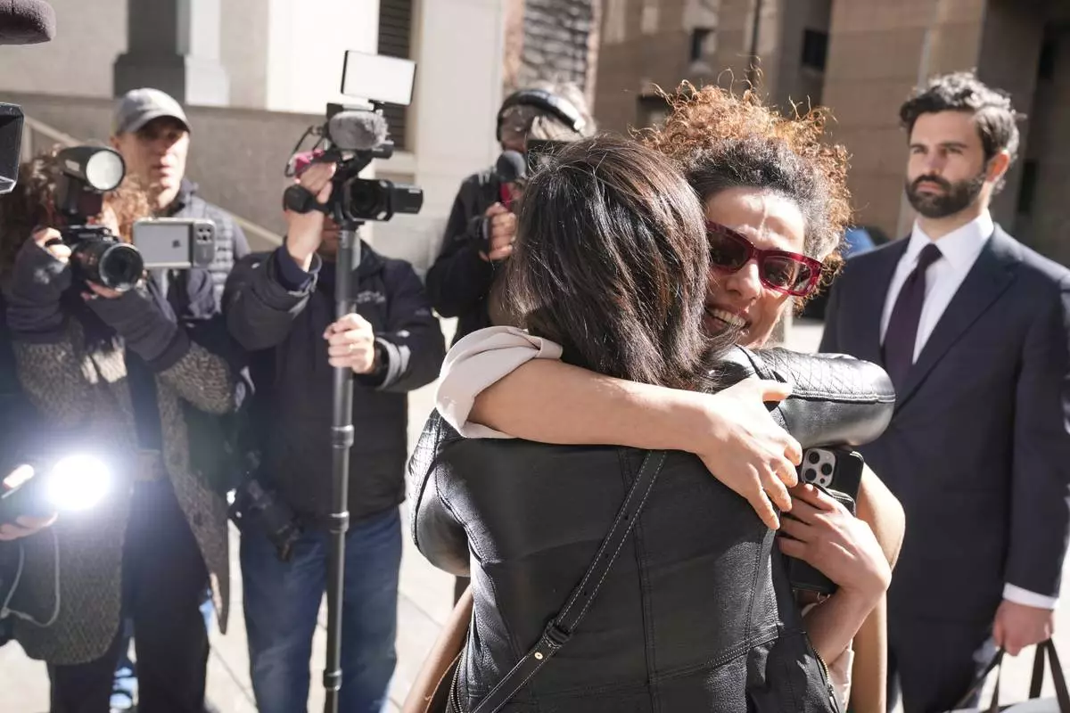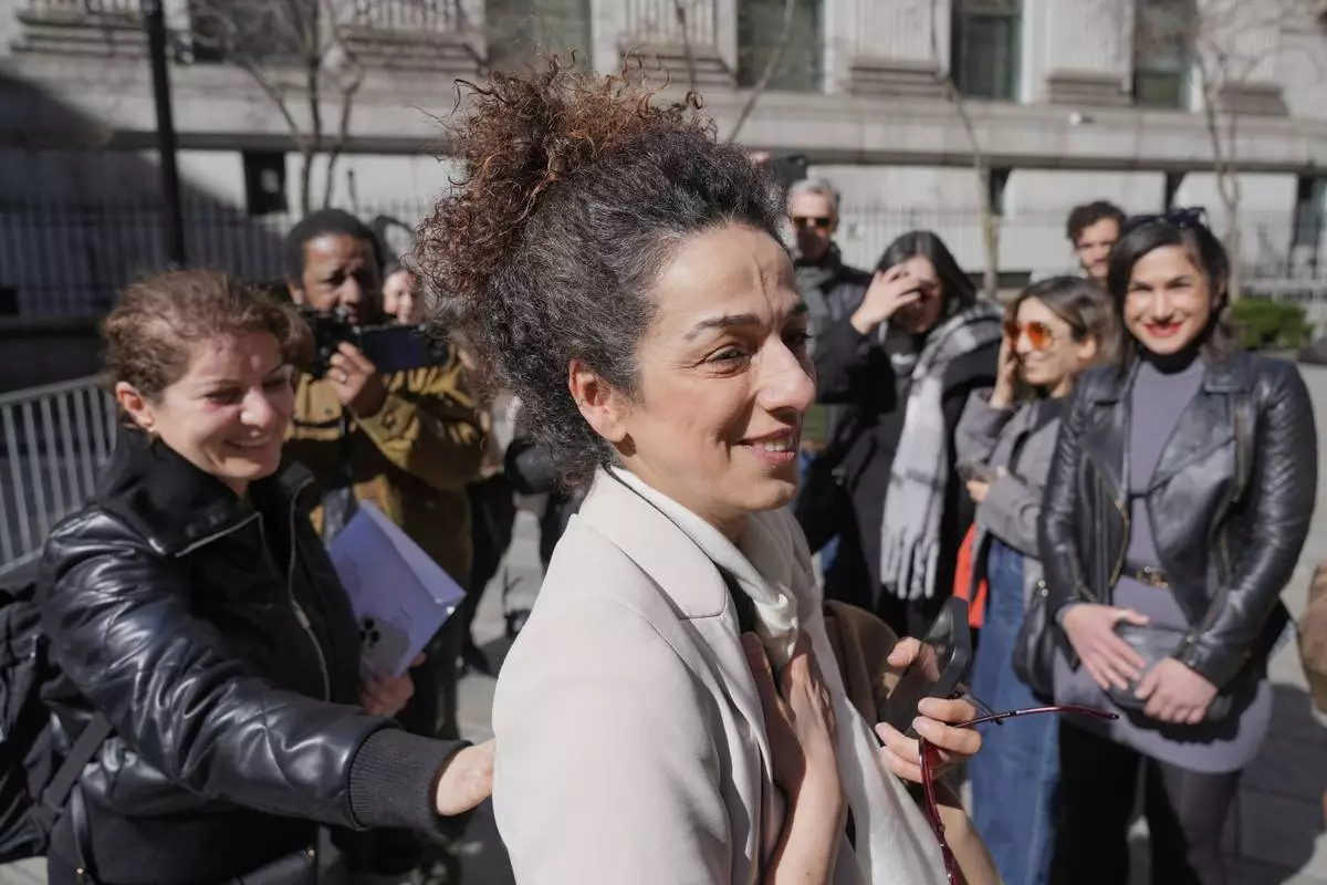 Masih Alinejad greets friends and supporters outside the federal courthouse after testifying at the trial of her alleged would-be assassins in New York, Tuesday, March 18, 2025. (AP Photo/Seth Wenig)