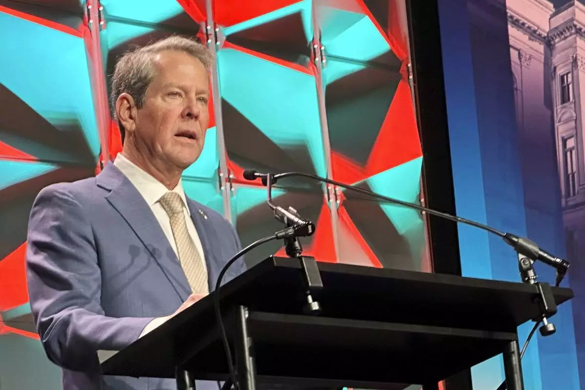 FILE - Georgia Gov. Brian Kemp addresses the Chamber of Commerce at the Georgia World Congress Center in Atlanta, Jan. 14, 2025. (AP Photo/Jeff Amy, File)