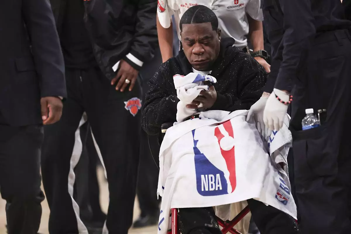 Actor-comedian Tracy Morgan sits in a wheelchair as he is tended to after he became ill and had to leave an NBA basketball game between the New York Knicks and Miami Heat in a wheelchair due to illness, Monday, March 17, 2025, in New York. (AP Photo/Heather Khalifa)