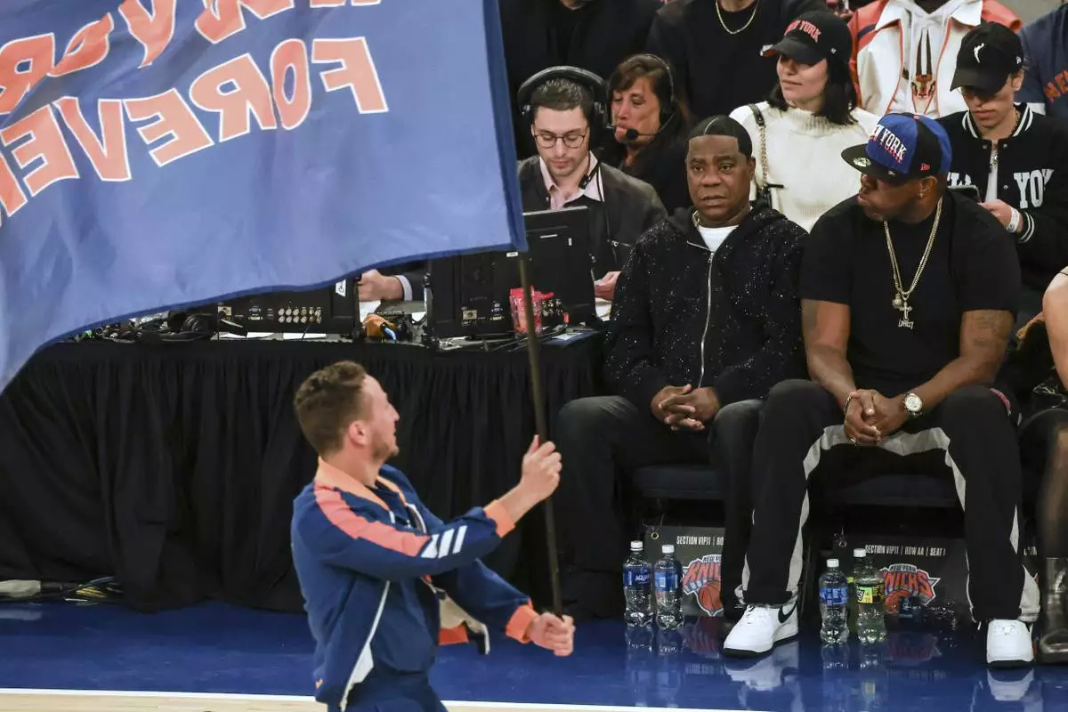 Actor-comedian Tracy Morgan, second from right, sits court side during an NBA basketball game between the New York Knicks and Miami Heat, Monday, March 17, 2025, in New York. (AP Photo/Heather Khalifa)