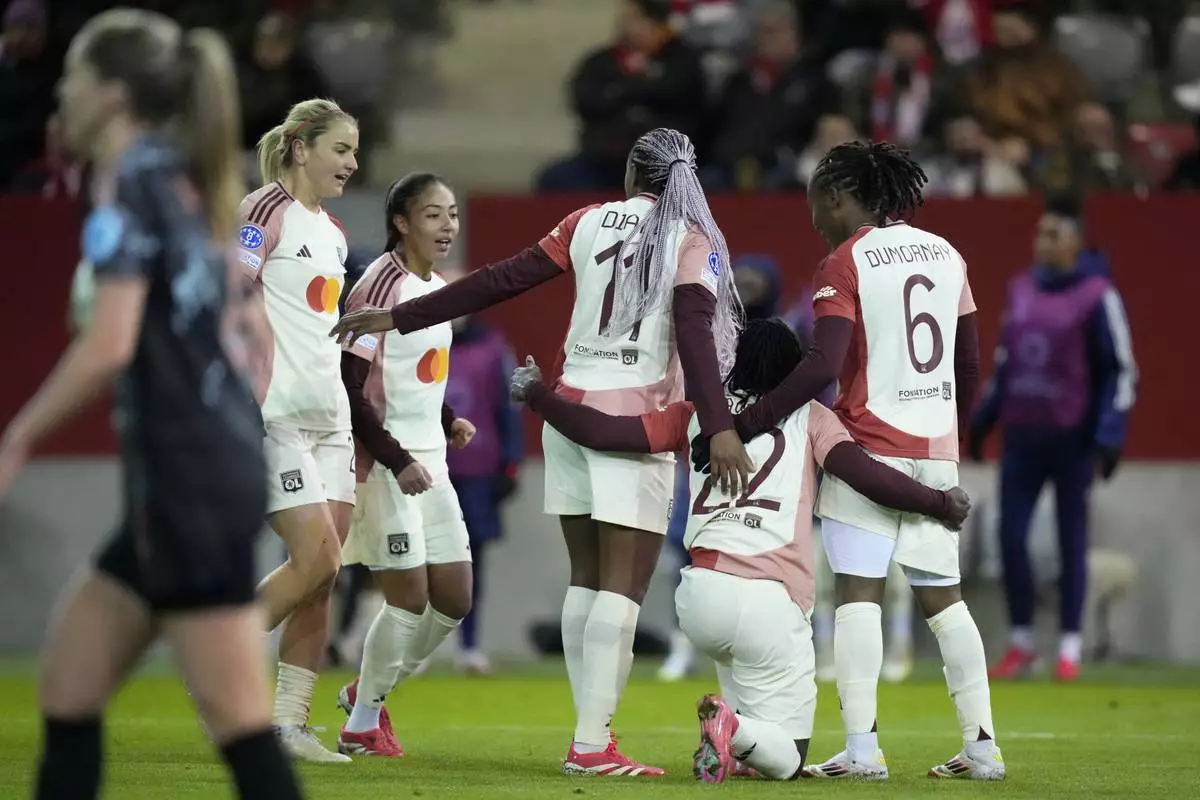Lyon players celebrate after Tabitha Chawinga, 2nd right, scored the opening goal past Bayern goalkeeper Maria-Luisa Grohs during the Women's Champions League quarterfinal first leg soccer match between FC Bayern Munich and Olympique Lyonnais at the FC Bayern Campus in Munich, Germany, Tuesday, March 18, 2025. (AP Photo/Matthias Schrader)