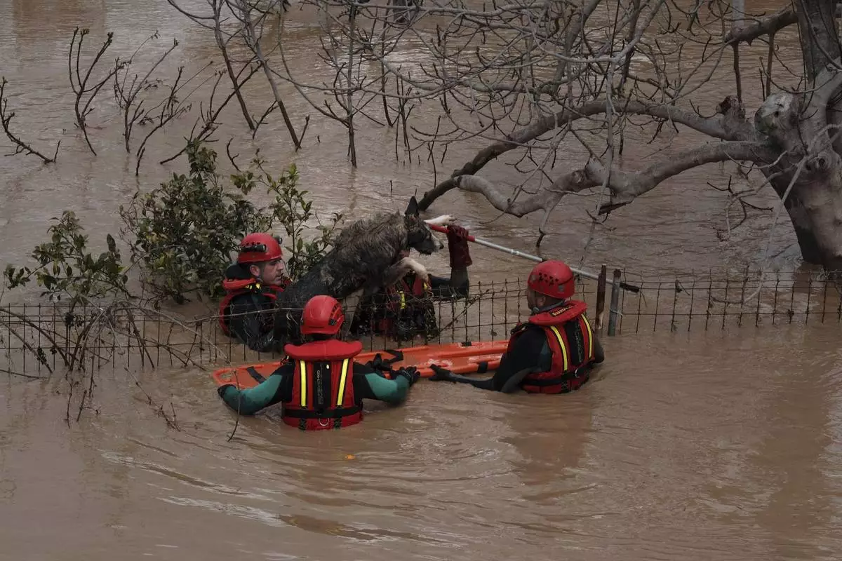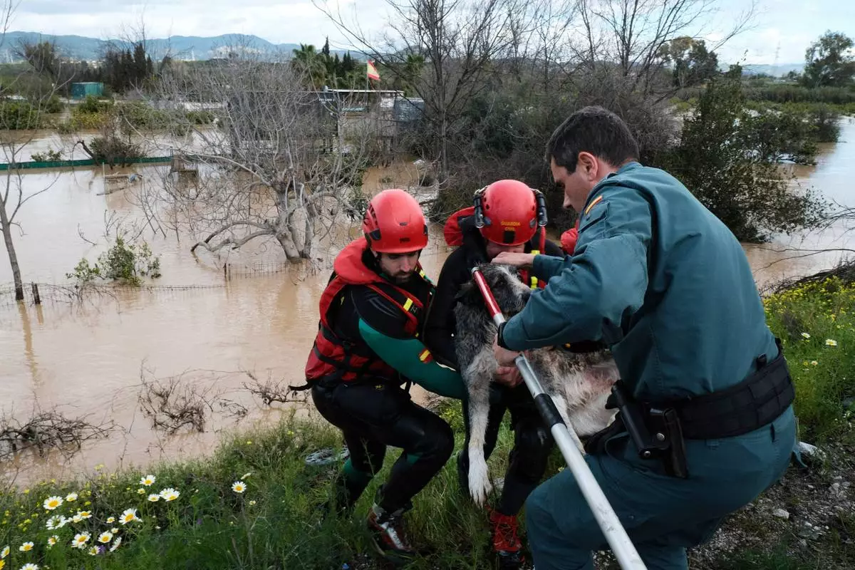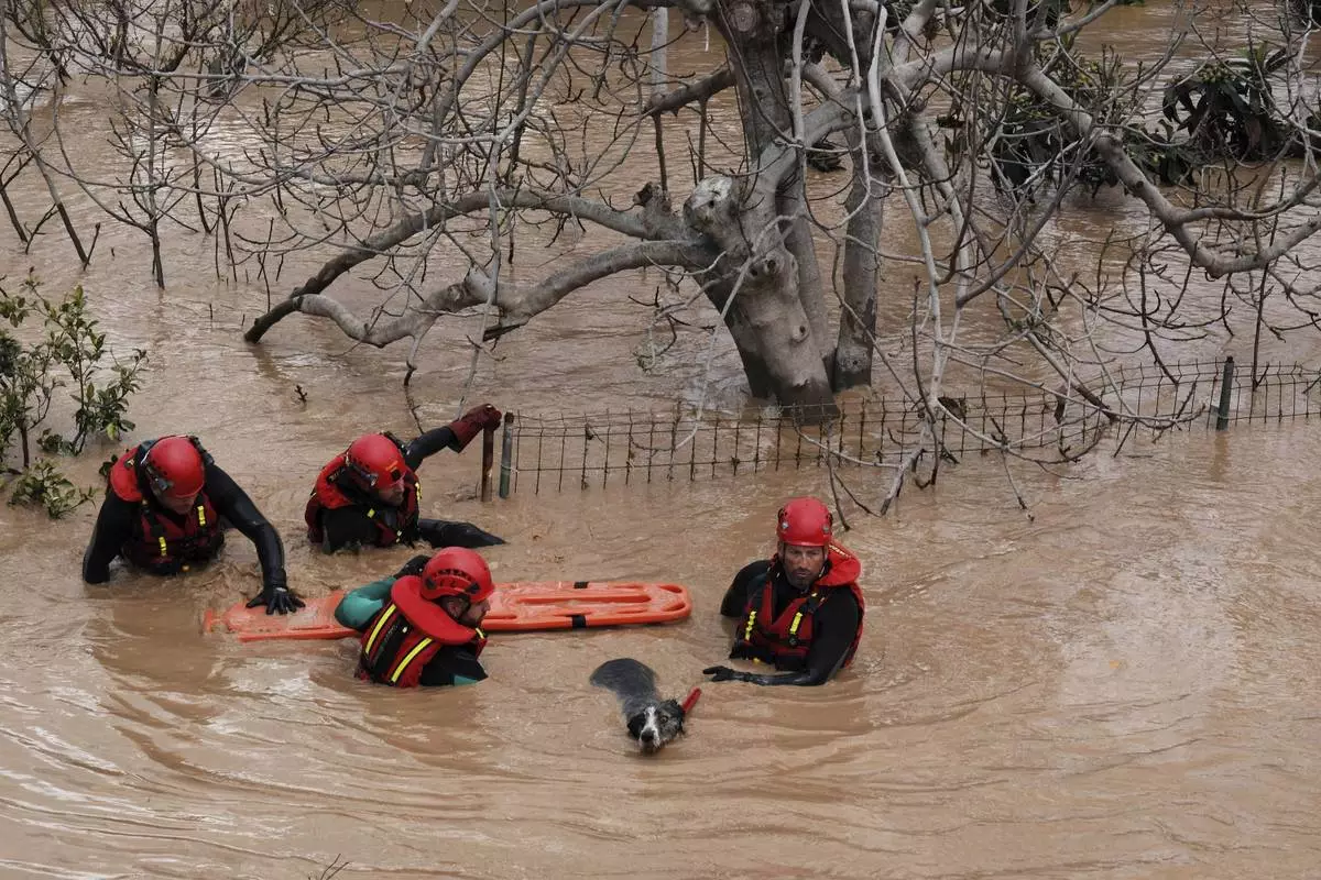 Emergency teams rescue a dog from flooded areas after heavy rains in Malaga, Spain, Tuesday, March 18, 2025. (AP Photo/Gregorio Marrero)