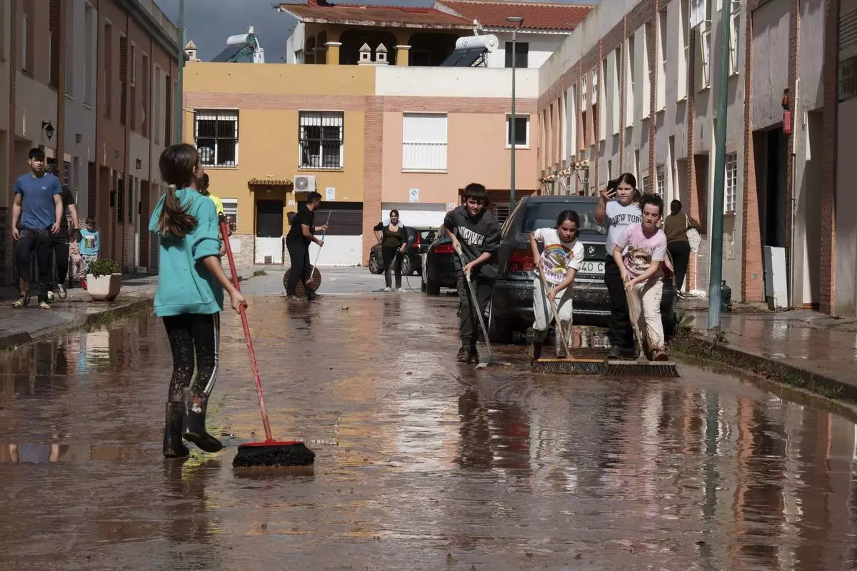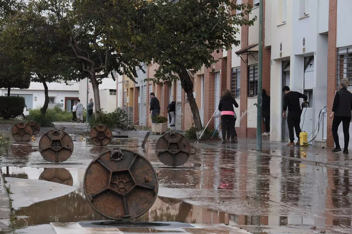 Residents clear mud from the streets after heavy rains in Campanillas, Malaga, Spain, Tuesday, March 18, 2025. (AP Photo/Gregorio Marrero)