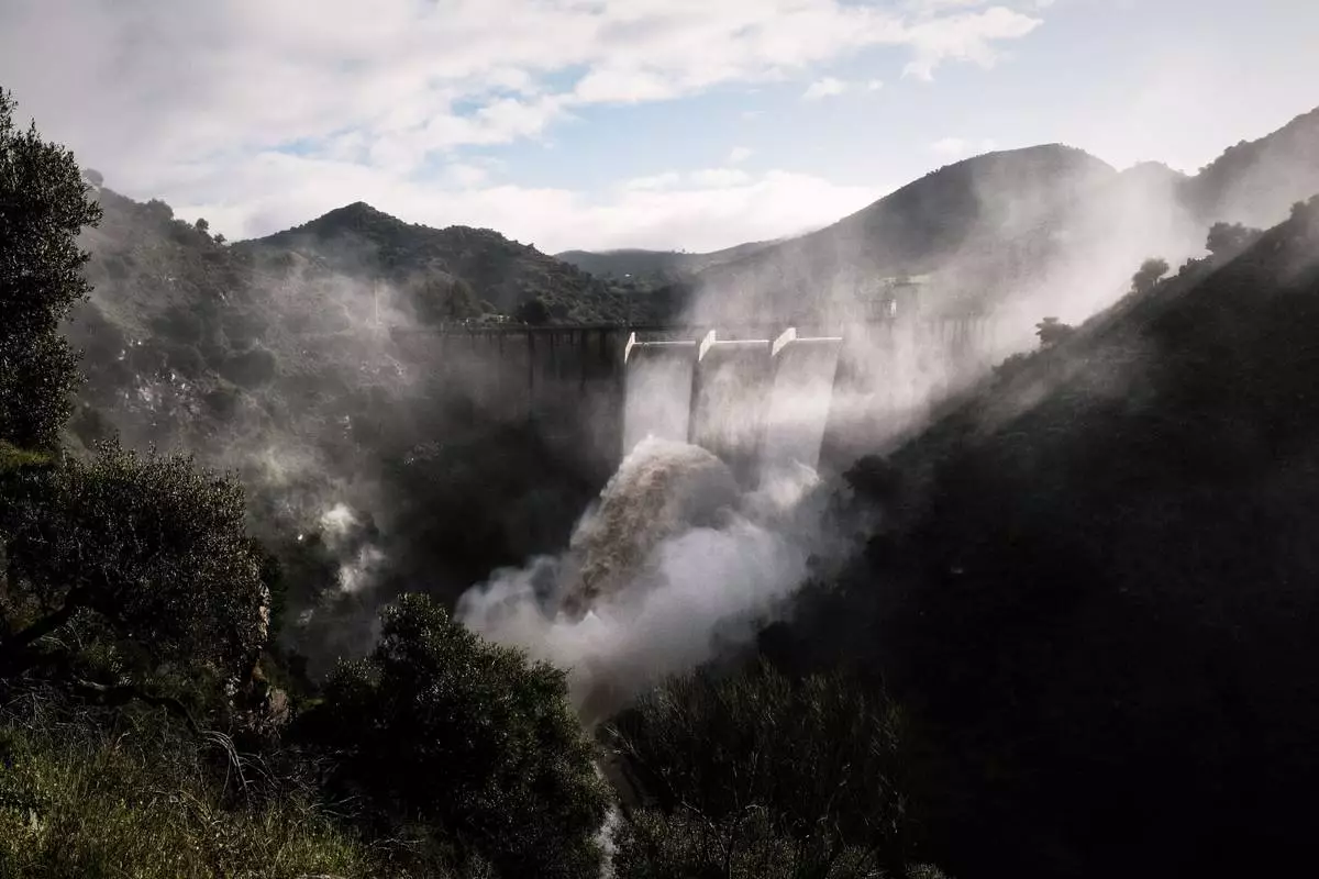 Water is released from the dam of Casasola in Malaga, Spain, Tuesday, March 18, 2025. (AP Photo/Gregorio Marrero)