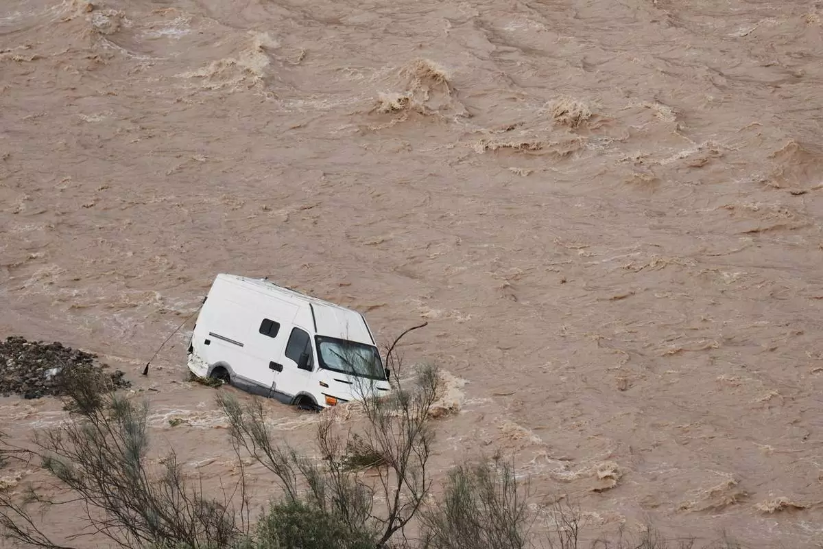 A van is photographed being swept away by the flood in Casasola, Malaga, Spain, Tuesday, March 18, 2025. (AP Photo/Gregorio Marrero)