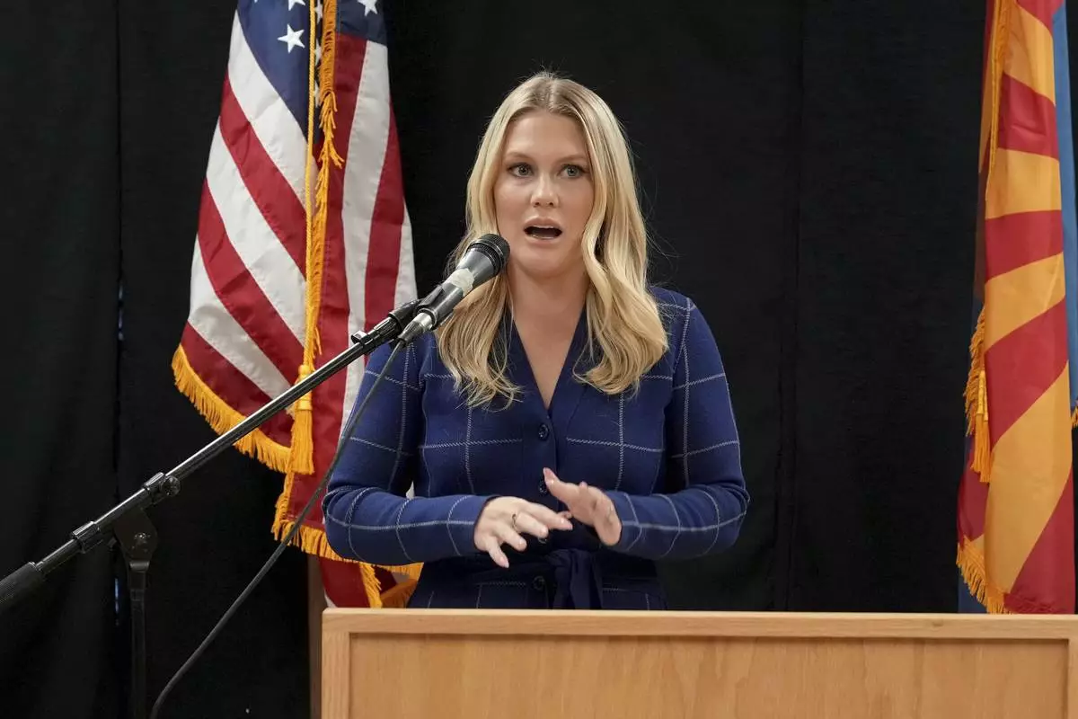 Ashley Holden of ABC 15 Arizona speaks about witnessing the execution of inmate Aaron Brian Gunches as counsel and family members of the victim look on during a press briefing at the Arizona State Prison Wednesday, March 19, 2025 in Florence, Ariz. (AP Photo/Darryl Webb)