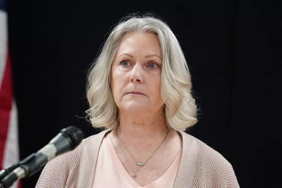 Karen Price sister of Ted Price takes a moment as she speaks about the execution of Aaron Brian Gunches at the Arizona State Prison Wednesday, March 19, 2025 in Florence, Ariz. (AP Photo/Darryl Webb)