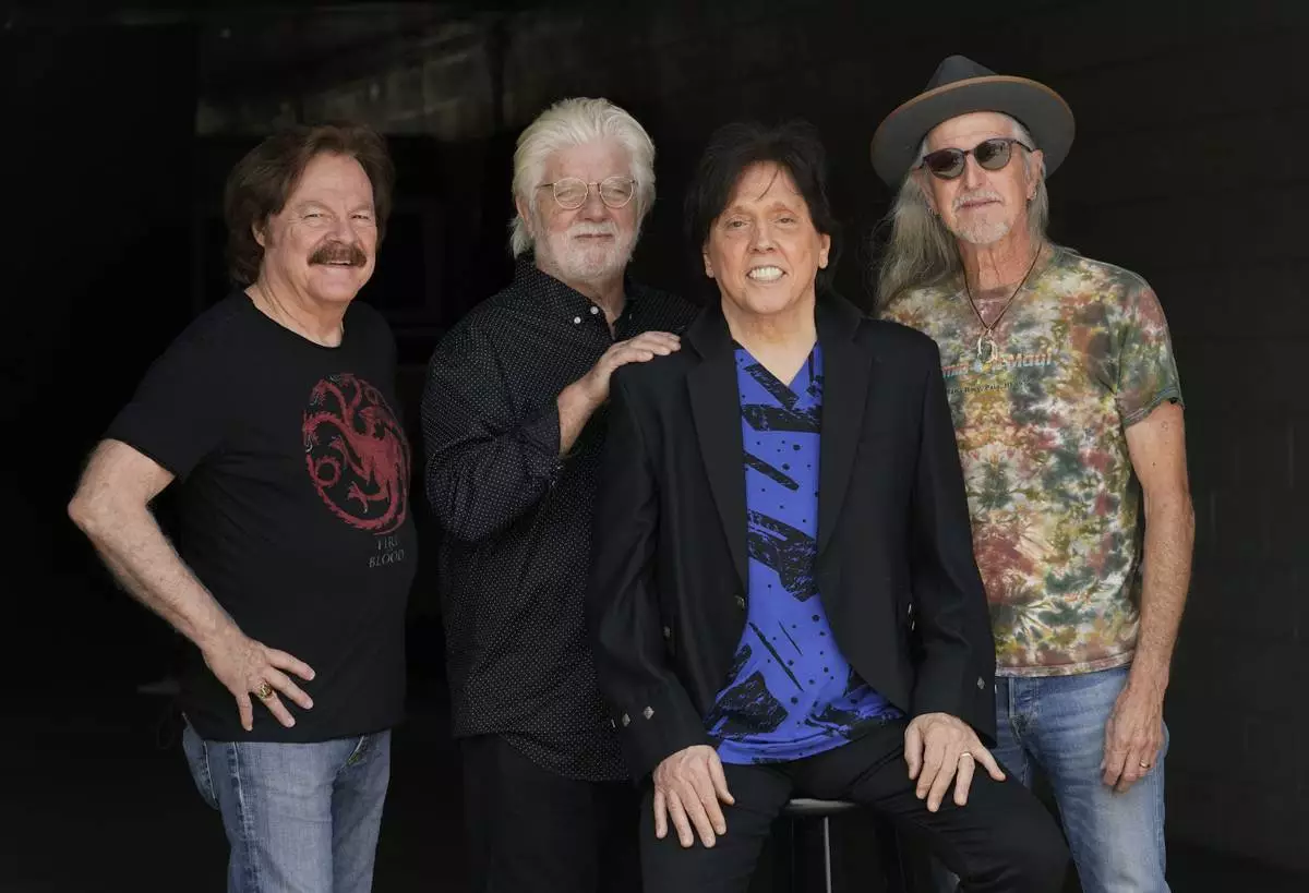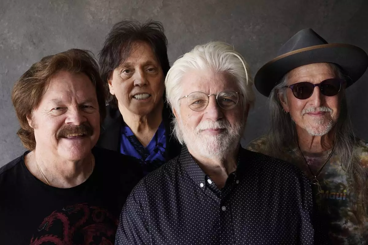 FILE - Tom Johnston, from left, Michael McDonald, John McFee and Pat Simmons of the Doobie Brothers pose for a portrait at Show Biz Studios in Los Angeles on Aug. 17, 2021. (AP Photo/Chris Pizzello, File)