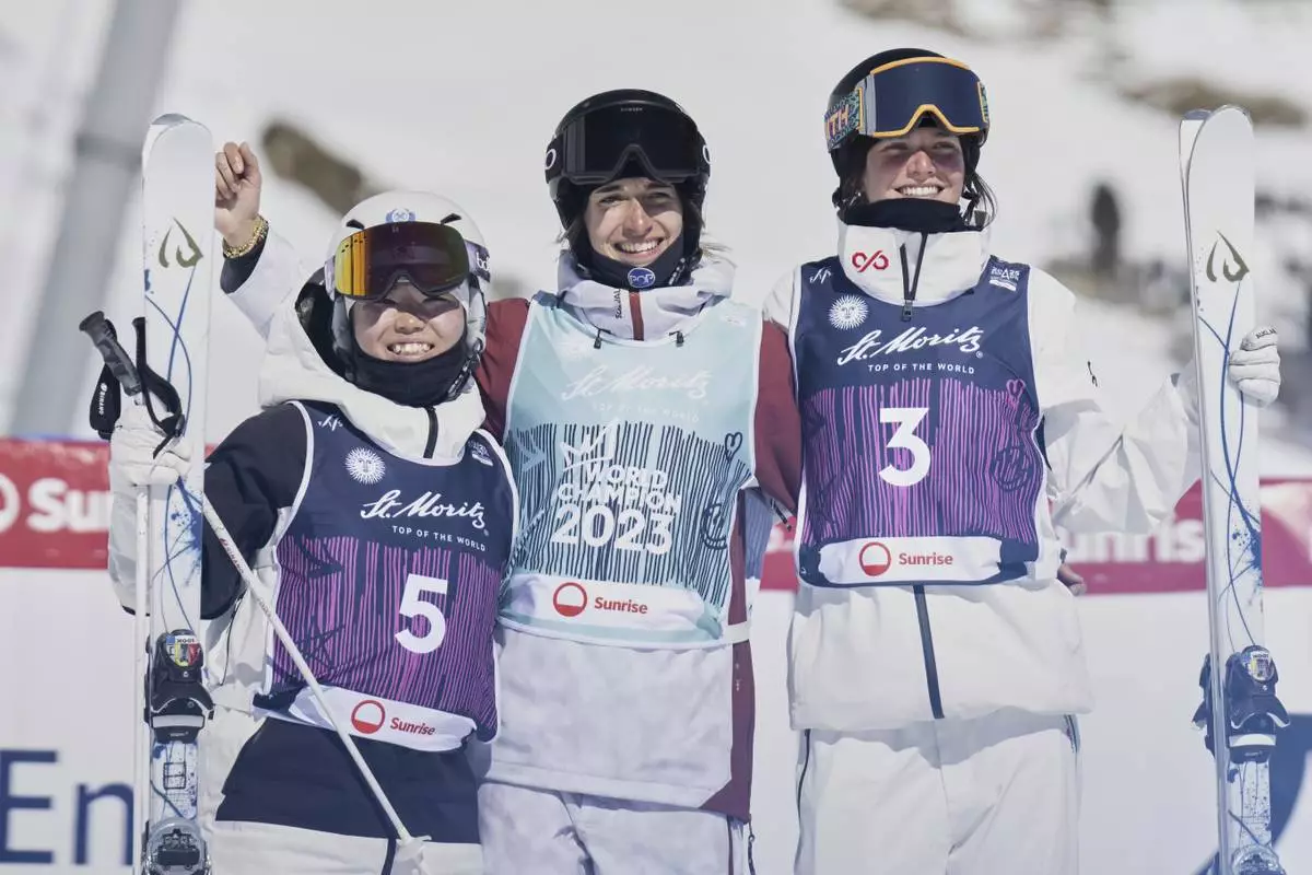 France's Perrine Laffont, center, gold medalist in a women's moguls at the Freestyle World Championships celebrates with silver medalist Japan's Hinako Tomitaka, left, and bronze medalist Canada's Maia Schwinghammer, in St. Moritz, Switzerland, Wednesday, March 19, 2025. (Gian Ehrenzeller/Keystone via AP)