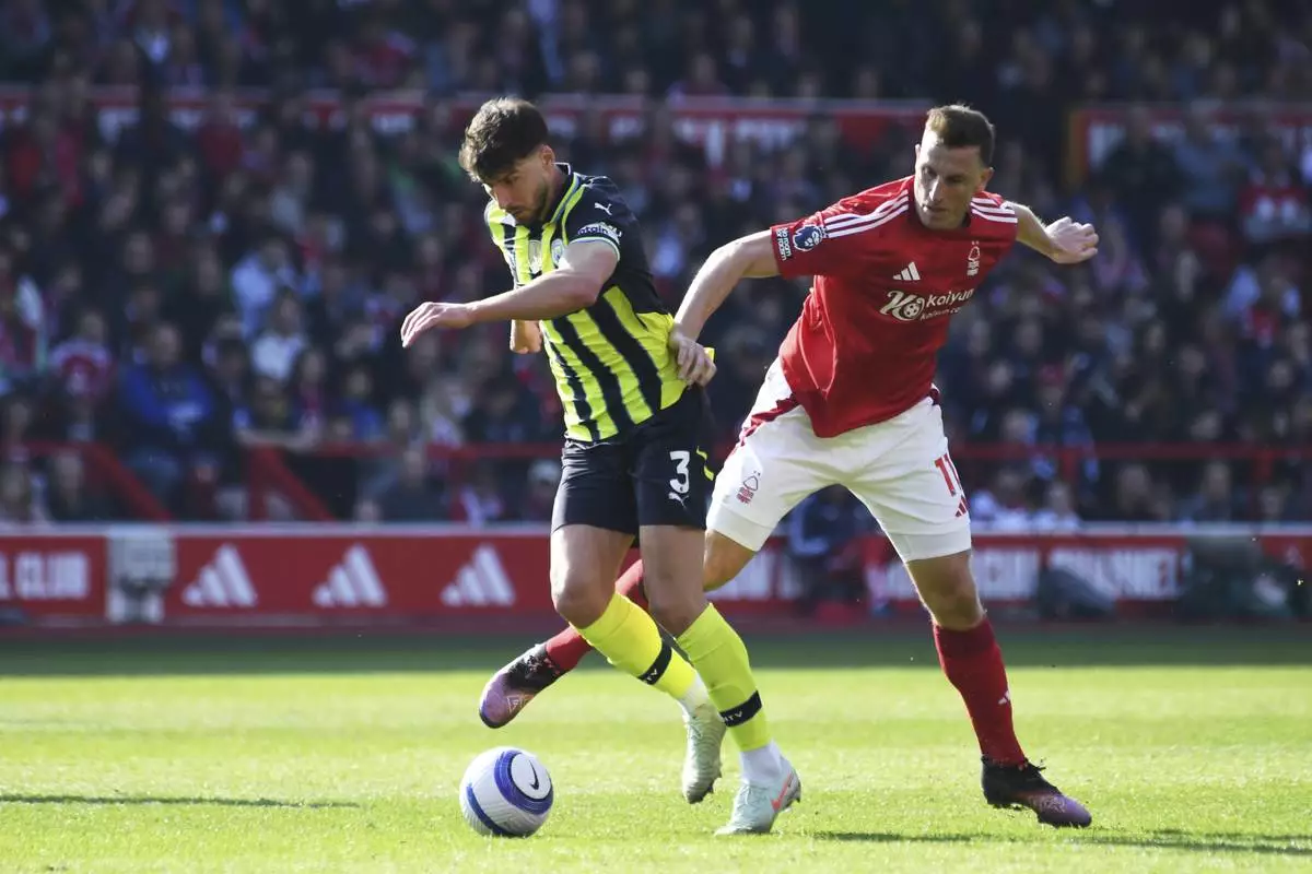 Nottingham Forest's Chris Wood, right, and Manchester City's Ruben Dias vie for the ball during the English Premier League soccer match between Nottingham Forest and Manchester City at the City Ground stadium, in Nottingham, England, Saturday, March 8, 2025. (AP Photo/Rui Vieira)