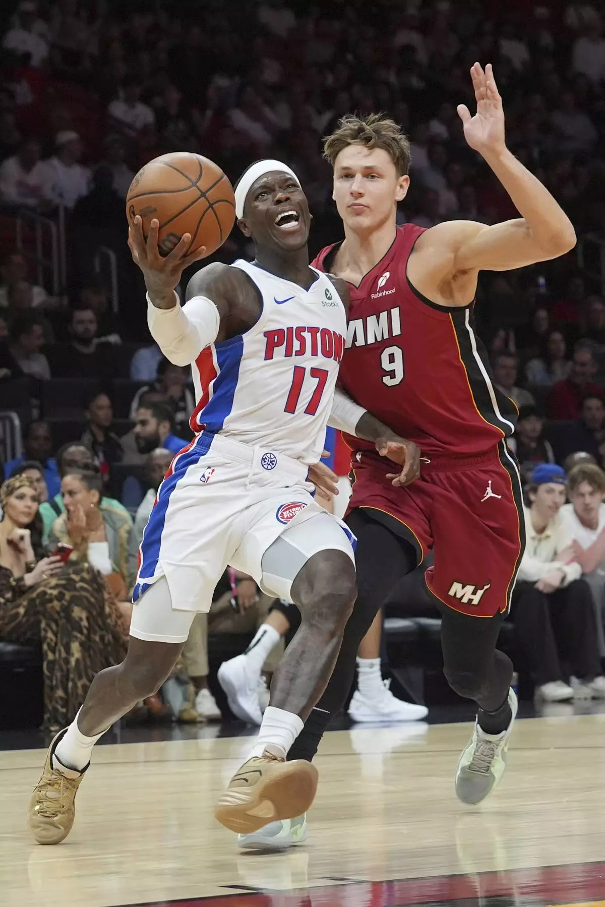 Detroit Pistons guard Dennis Schroder (17) drives to the basket as Miami Heat guard Pelle Larsson (9) defends during the first half of an NBA basketball game, Wednesday, March 19, 2025, in Miami. (AP Photo/Marta Lavandier)