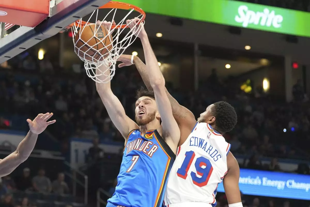 Oklahoma City Thunder forward Chet Holmgren (7) dunks near Philadelphia 76ers guard Jared Butler (12) and forward Justin Edwards (19) during the second half of an NBA basketball game, Wednesday, March 19, 2025, in Oklahoma City. (AP Photo/Kyle Phillips)