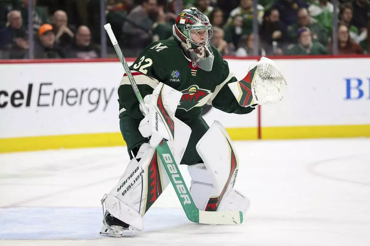 Minnesota Wild goaltender Filip Gustavsson (32) defends his net against the Seattle Kraken during the second period of an NHL hockey game Wednesday, March 19, 2025, in St. Paul, Minn. (AP Photo/Matt Krohn)