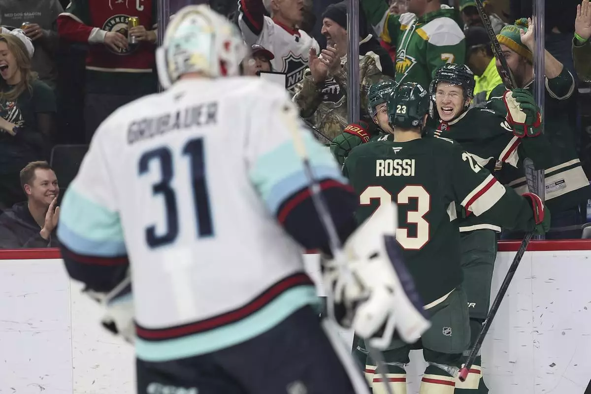 Minnesota Wild left wing Matt Boldy, right, celebrates his goal with teammates as Seattle Kraken goaltender Philipp Grubauer (31) looks on during the first period of an NHL hockey game Wednesday, March 19, 2025, in St. Paul, Minn. (AP Photo/Matt Krohn)