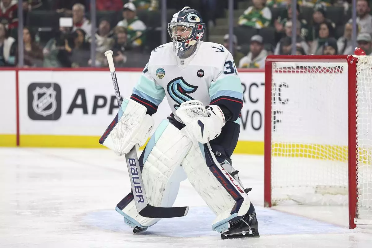 Seattle Kraken goaltender Philipp Grubauer (31) defends his net against the Minnesota Wild during the first period of an NHL hockey game Wednesday, March 19, 2025, in St. Paul, Minn. (AP Photo/Matt Krohn)