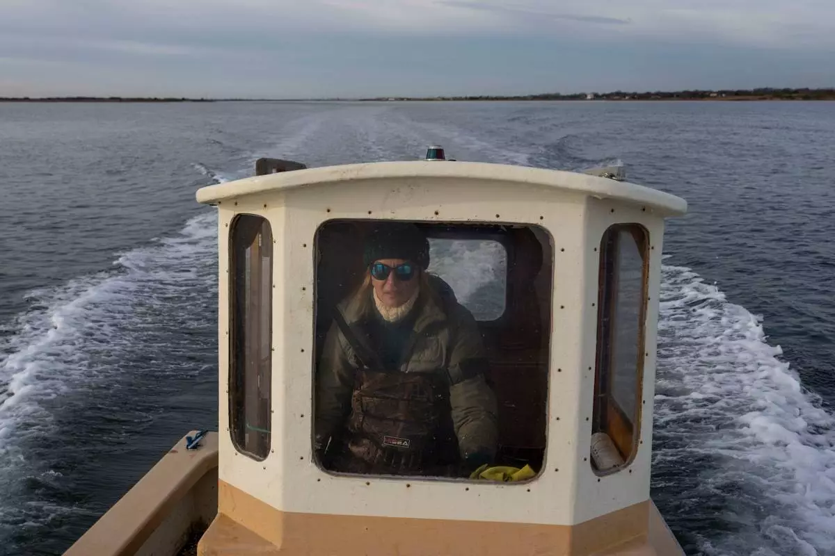 Retired WNBA star and Hall of Famer Sue Wicks rides her boat to check on her oysters in Moriches Bay in New York, Thursday, Nov. 20, 2025. (AP Photo/Yuki Iwamura)