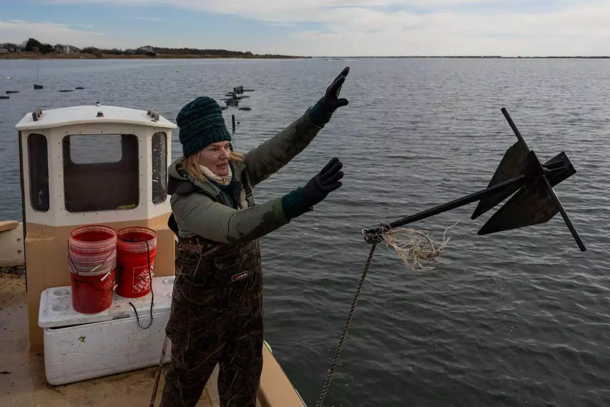 After seven days of wind, the morning is finally calm enough on New York’s East Moriches Bay for Sue Wicks to jetty her boat to check on her oysters. Hundreds of cages pop out at odd angles from their lines, and a few float away.