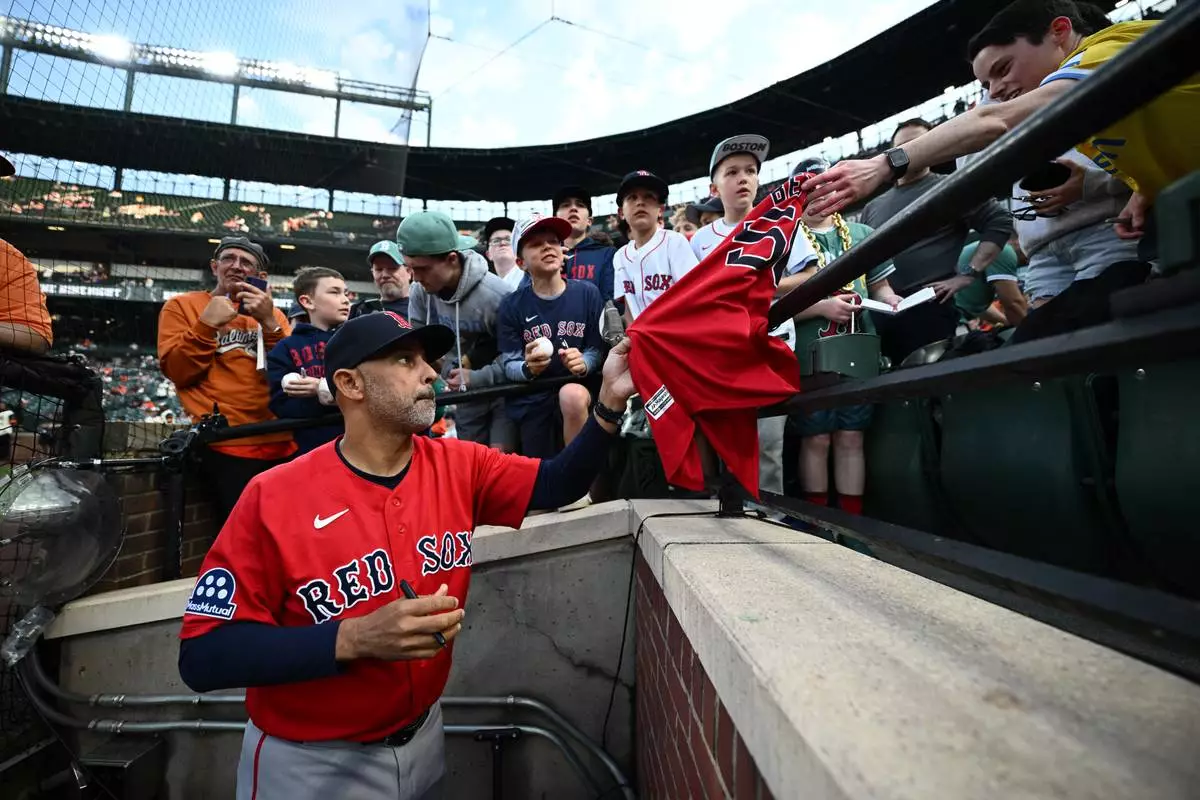 Boston Red Sox manager Alex Cora, foreground, gives autographs to fans before a baseball game against the Baltimore Orioles, Friday, April 24, 2026, in Baltimore. (AP Photo/Nick Wass)