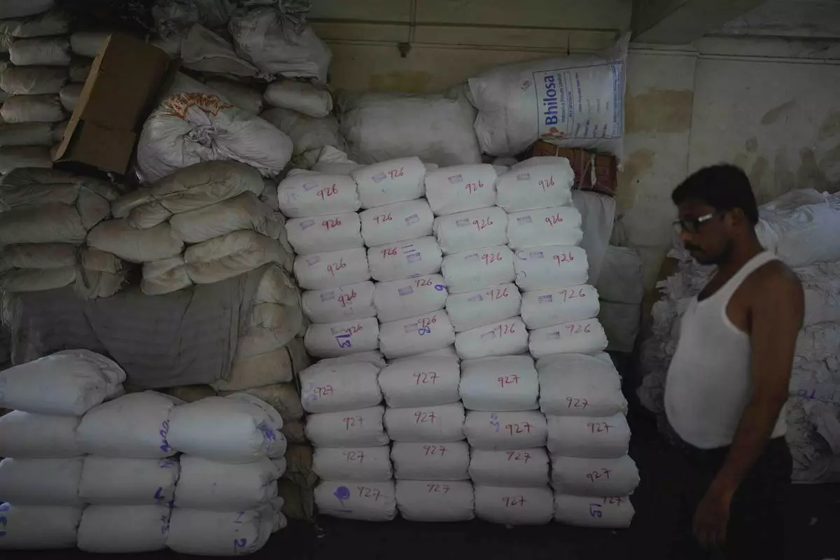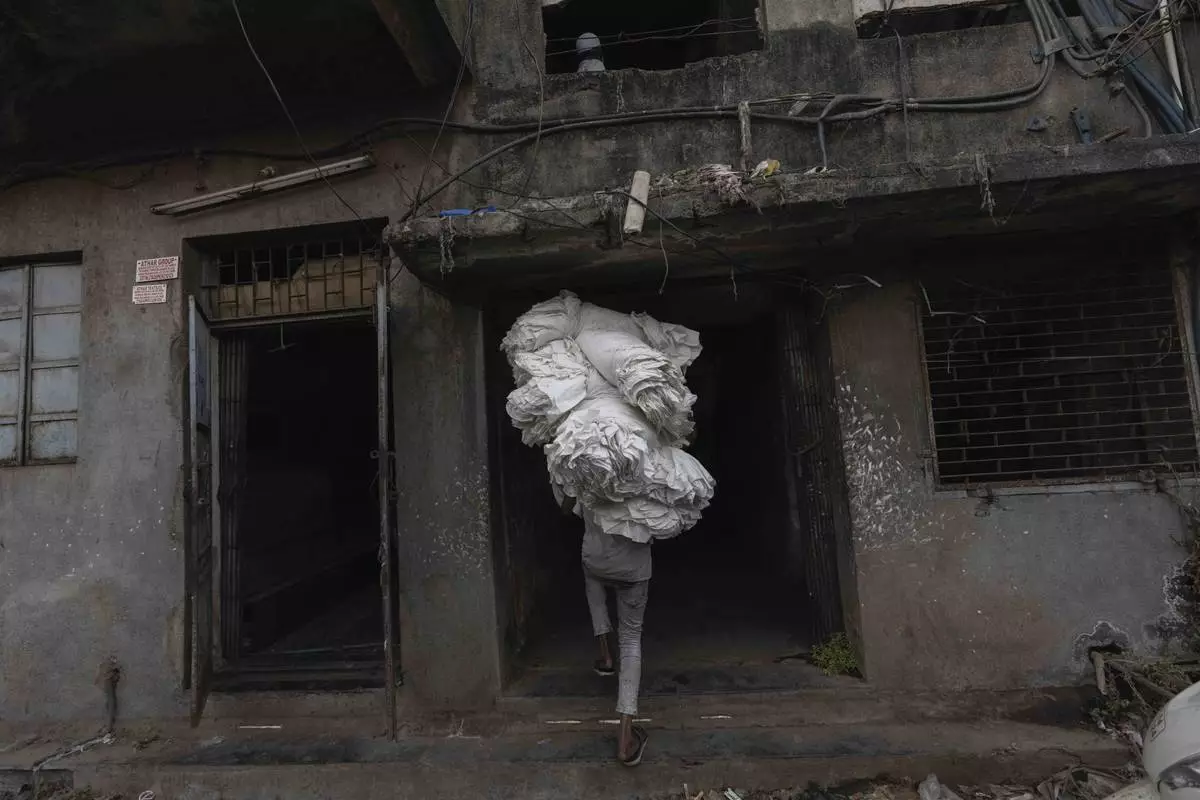 A man carries bundles of cloth manufactured at a power loom workshop in Bhiwandi, India, Feb. 27, 2025. (AP Photo/Rafiq Maqbool)