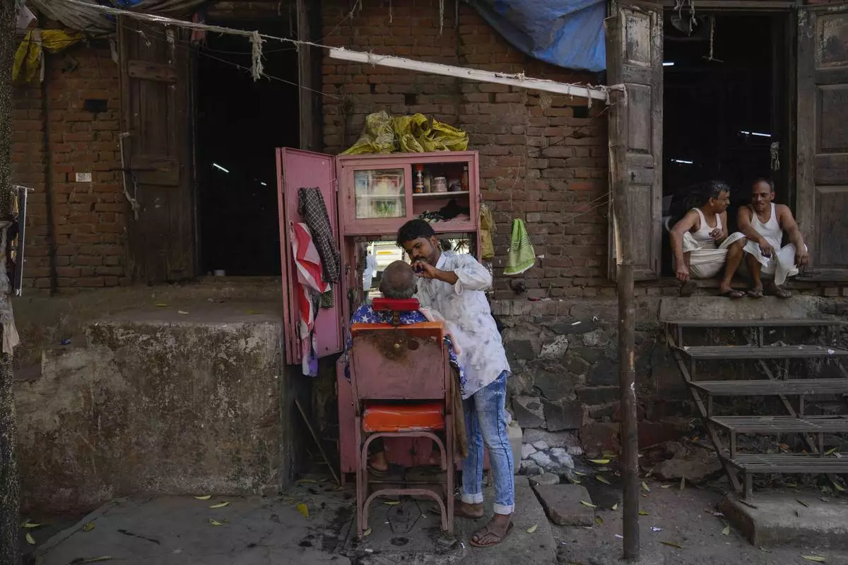 A worker gets his beard trimmed by a barber as others take a break outside a power loom workshop in Bhiwandi, India, Feb. 27, 2025. (AP Photo/Rafiq Maqbool)