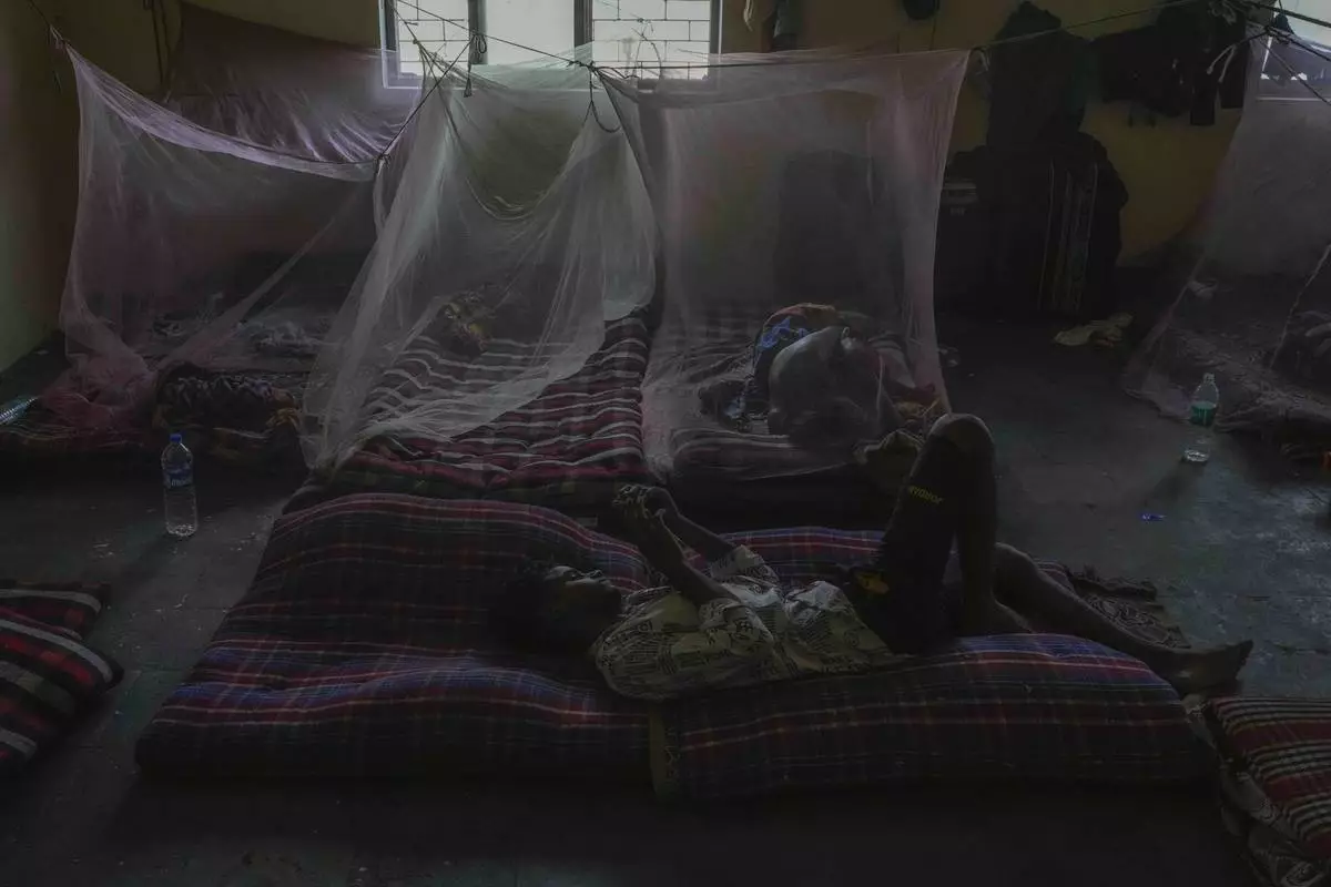 A man sleeps under a mosquito net while another uses his phone in their shared one-room accommodation near a power loom workshop, where they work, in Bhiwandi, India, Feb. 27, 2025. (AP Photo/Rafiq Maqbool)