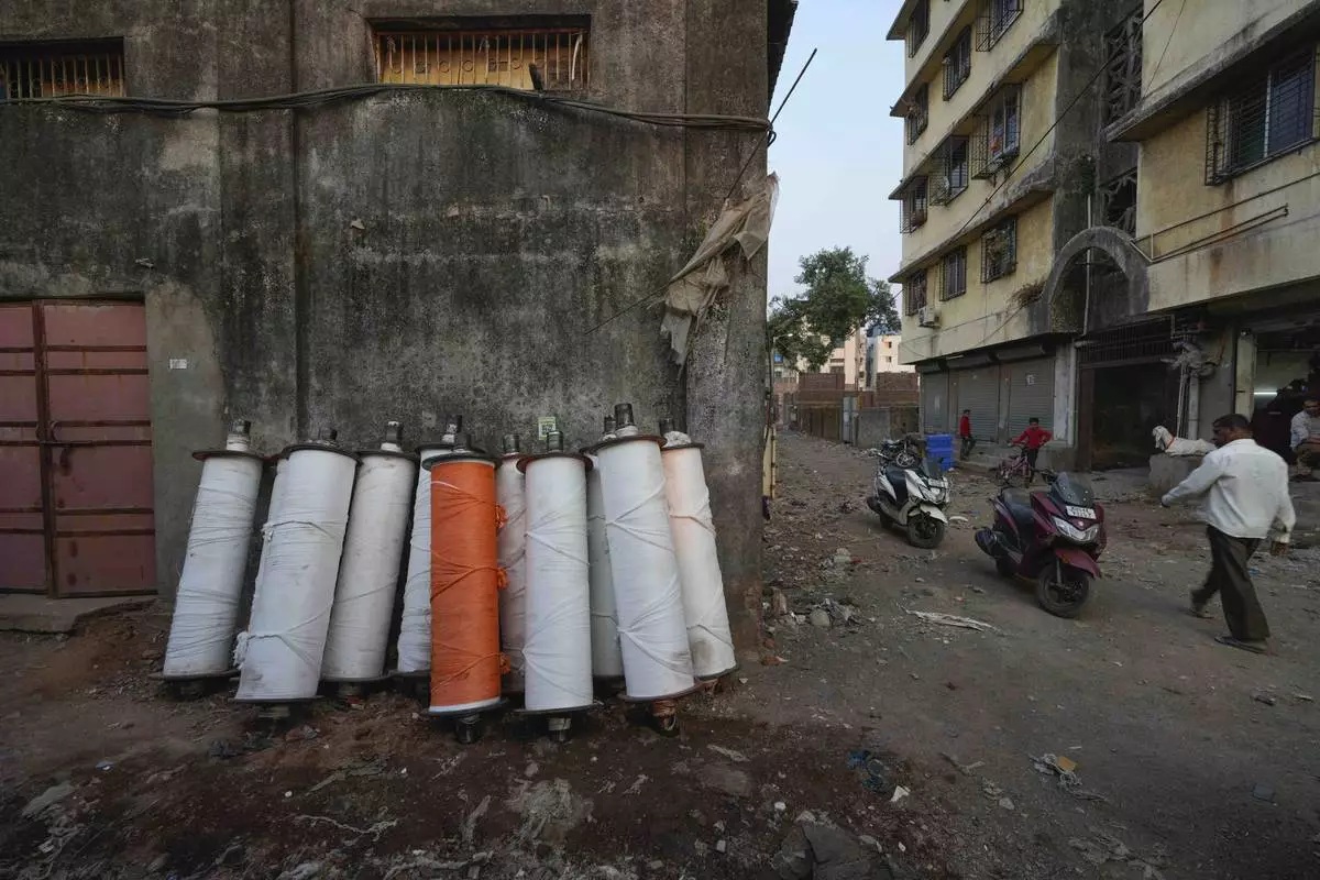 Wrapped warp beam yarns for weaving cloth on a power loom are kept outside a workshop in Bhiwandi, India, Feb. 27, 2025. (AP Photo/Rafiq Maqbool)