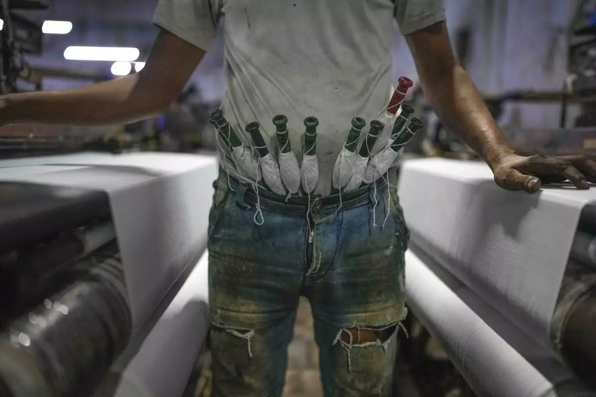A worker keeps thread bobbins tucked in the waist of his trousers at a power weaving loom workshop in Bhiwandi, India, Feb. 27, 2025. (AP Photo/Rafiq Maqbool)
