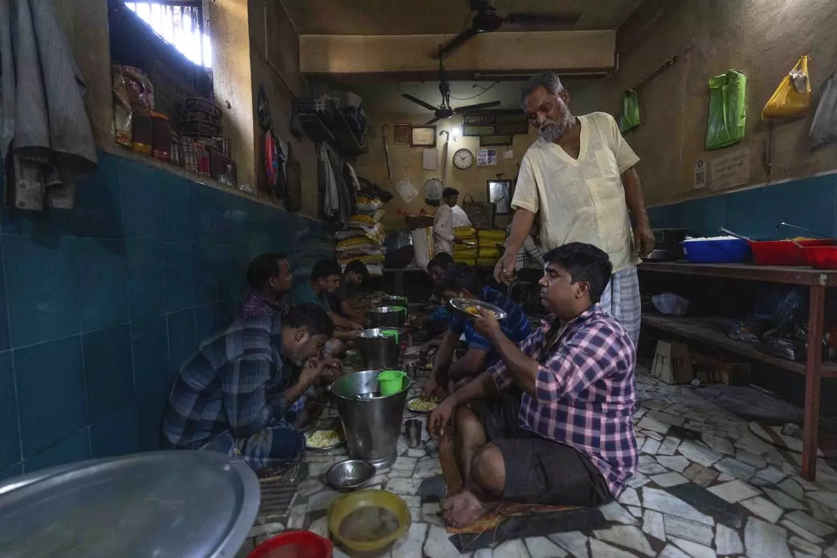 Workers from a power loom workshop eat at a local roadside eatery during lunch break, in Bhiwandi, India, Feb. 27, 2025. (AP Photo/Rafiq Maqbool)