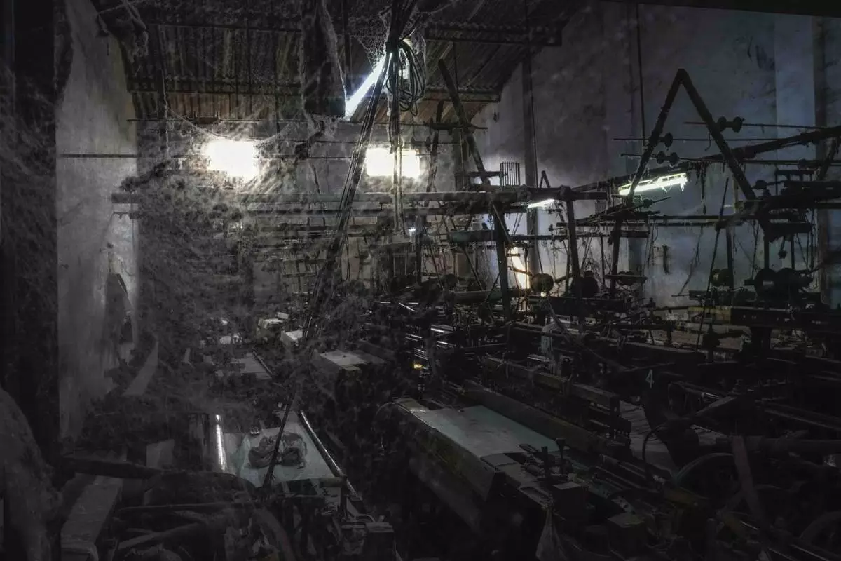 Cobwebs cover the machines at a non-operating power loom workshop in Bhiwandi, India, Feb. 27, 2025. (AP Photo/Rafiq Maqbool)