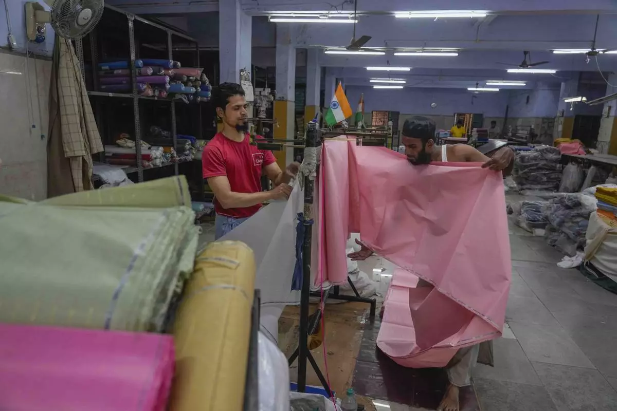Workers measure cloth at a power weaving loom workshop in Bhiwandi, India, Feb. 27, 2025. (AP Photo/Rafiq Maqbool)