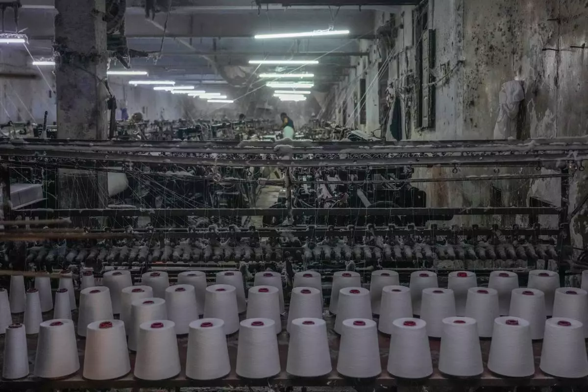 Reels of yarn feed a power weaving loom at a workshop in Bhiwandi, India, Feb. 25, 2025. (AP Photo/Rafiq Maqbool)
