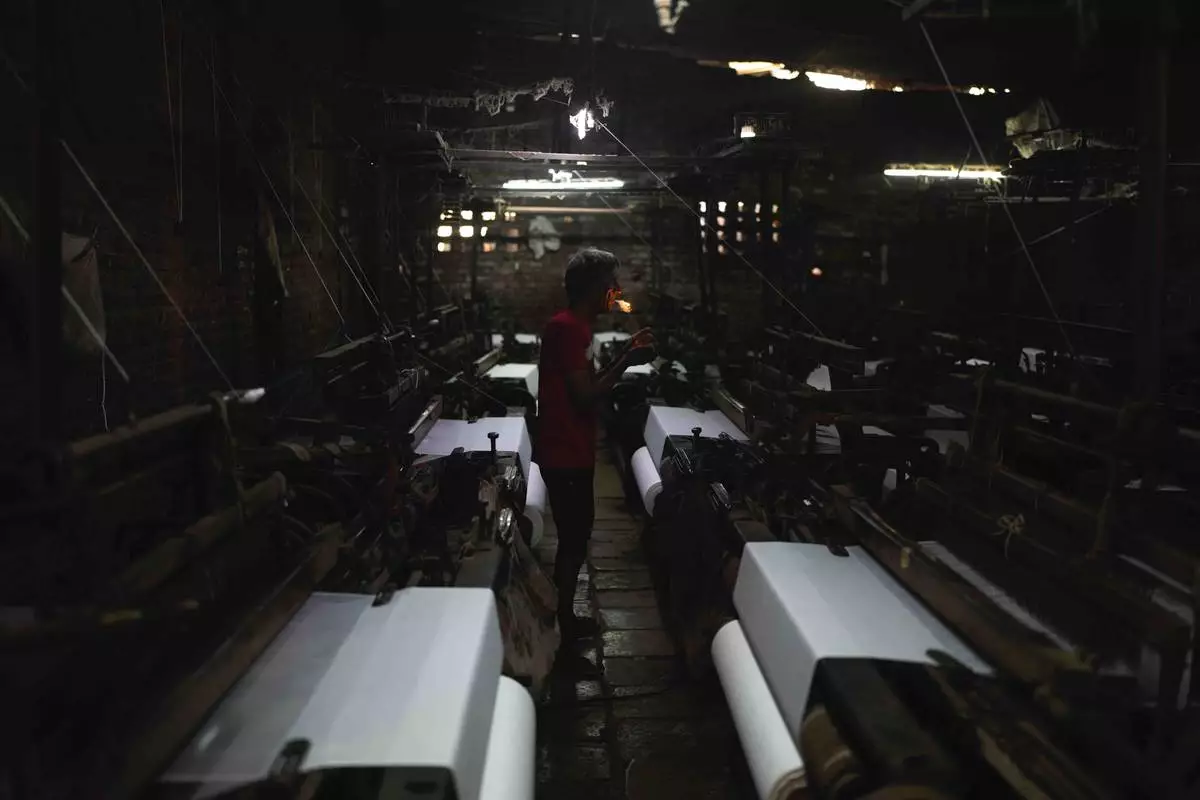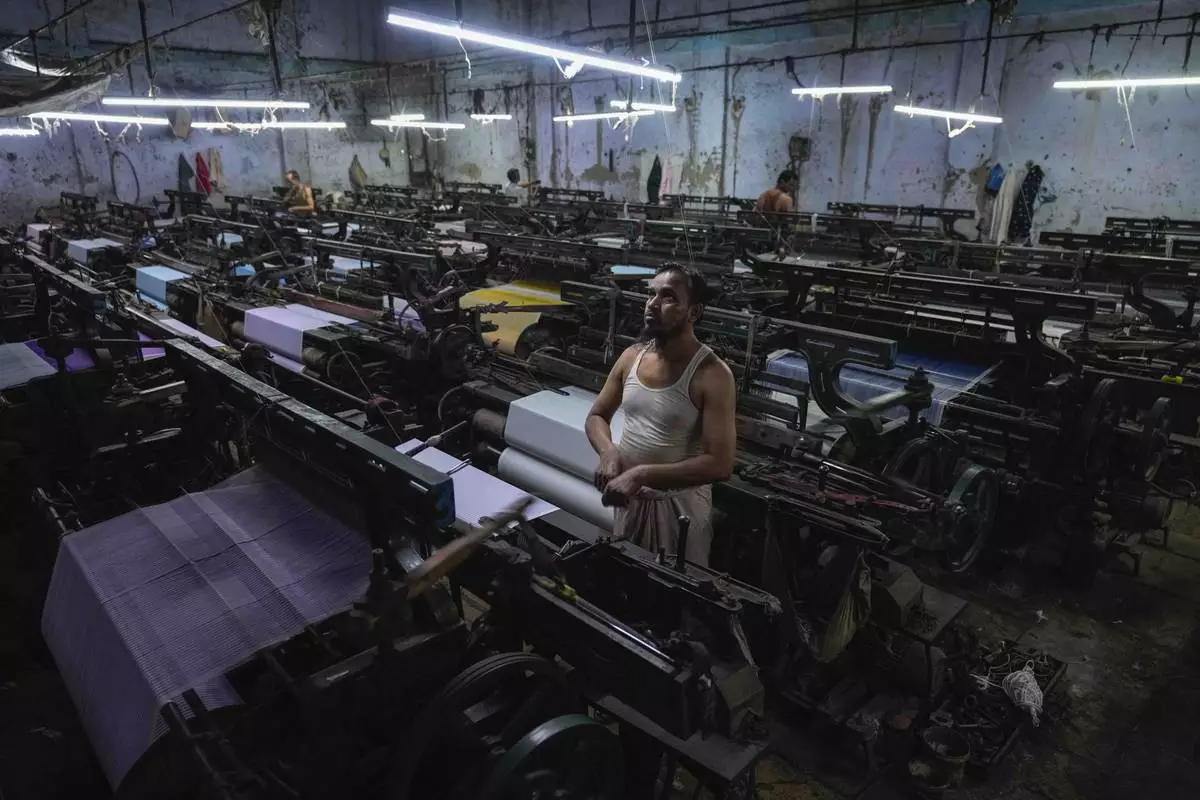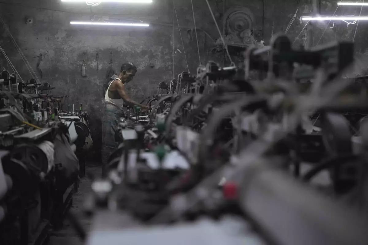 A workers operates a power loom at a workshop in Bhiwandi, India, Feb. 27, 2025. (AP Photo/Rafiq Maqbool)