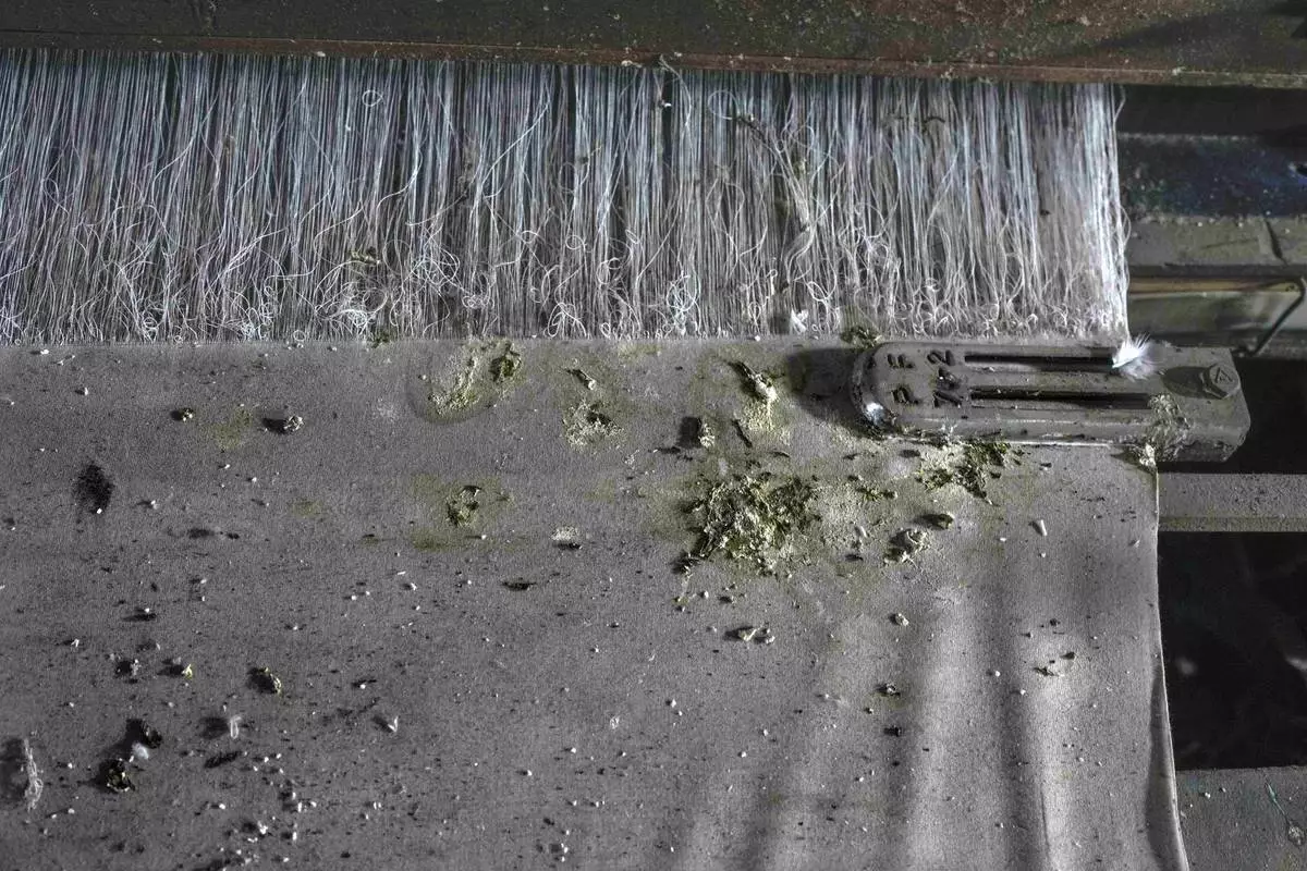Bird droppings gather on an unfinished piece of clothe at a nonoperational power loom workshop in Bhiwandi, India, Feb. 27, 2025. (AP Photo/Rafiq Maqbool)