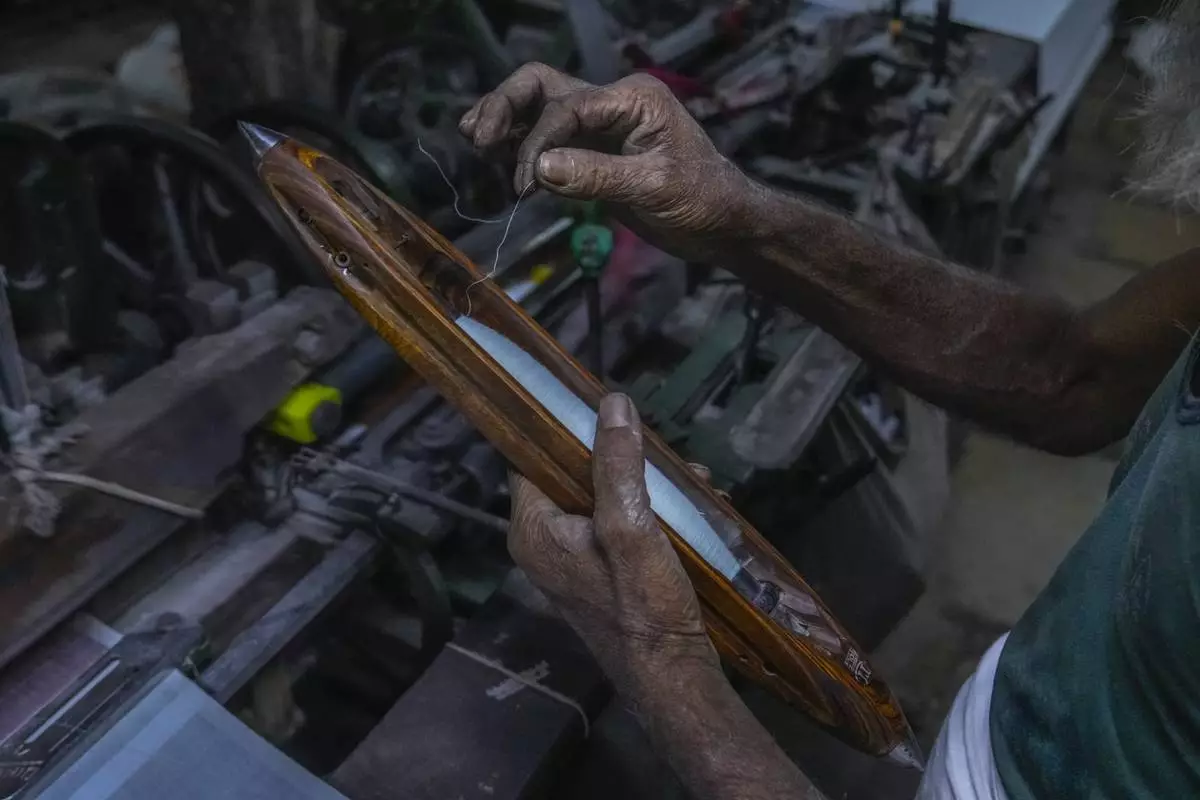 A weaver pulls a length of thread from a shuttle before feeding it to a power weaving loom at a workshop in Bhiwandi, India, Feb. 25, 2025. (AP Photo/Rafiq Maqbool)