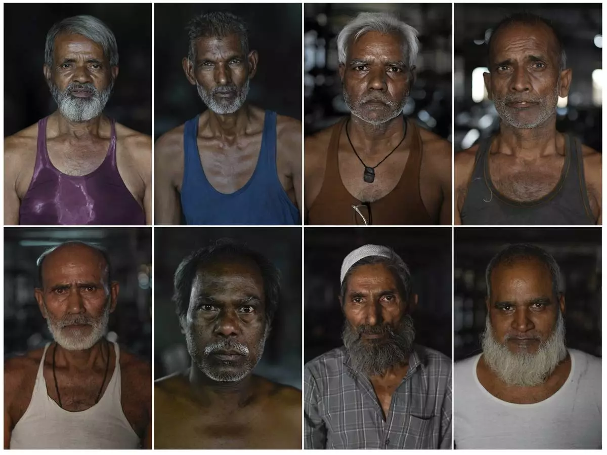 This combination photo shows portraits of power loom operators shot in February 2025 in Bhiwandi, India; From left, top row, Mohammed Amin Ansari 65, Abdul Qayoom 55, Lalmanth Ramdas Paswan, 55, Talim shah, 60; From left, bottom row, Mohammed Ibrahim 60, Mohammed Ilyyas, 65, Abdul Kamaluddin, 69, and Nissar Ahmad 50. (AP Photo/Rafiq Maqbool)