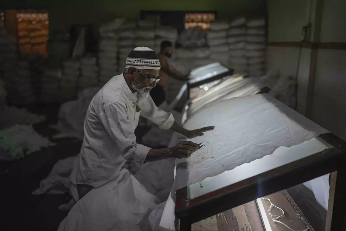 Ghulam Ahmad inspects a sheet of cloth for defects at a power loom workshop in Bhiwandi, India, Feb. 27, 2025. (AP Photo/Rafiq Maqbool)